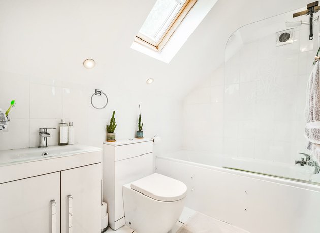 Upstairs, the heart of the home awaits. A stunning dual-aspect living space combining lounge and kitchen/diner. The standout feature here is the Juliette balcony with bi-fold doors that frame far-reaching views over Epping Forest. The sitting area offers ample space for a dining table and lounge furniture, while the modern kitchen comes complete with sleek light-wood cabinetry, granite worktops, and fully integrated appliances including oven, hob, extractor fan, fridge/freezer, dishwasher, and washing machine. A smart, fully tiled bathroom in a crisp white suite completes the internal accommodation.