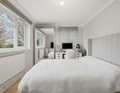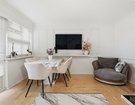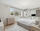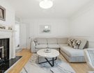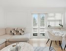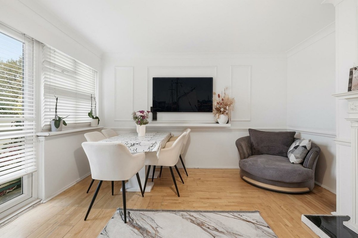The spacious lounge/diner is finished with crisp white walls, elegant panelling, and a feature fireplace, creating a stylish yet homely space perfect for entertaining. French doors open onto a private balcony, flooding the room with natural light and offering a pleasant spot to relax.
