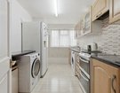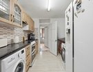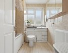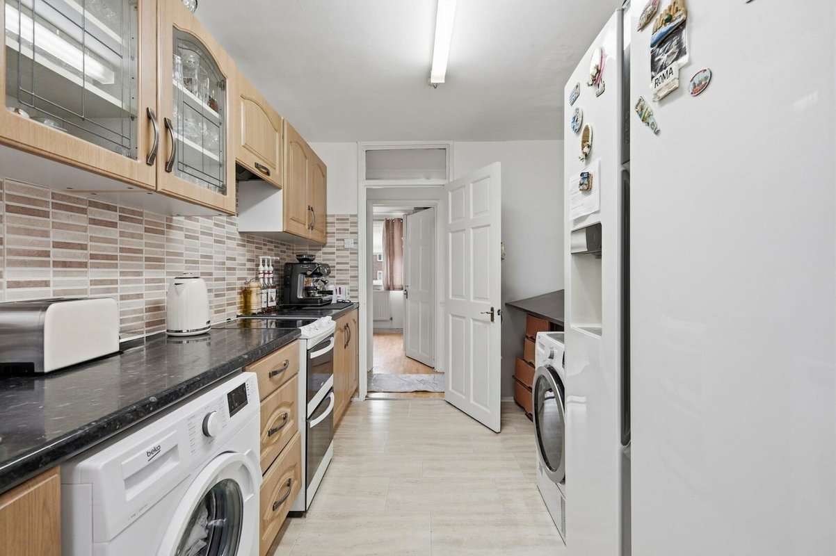 The fitted kitchen benefits from a large window, ensuring plenty of light and ventilation, while the family bathroom includes a white suite with an overhead shower.
