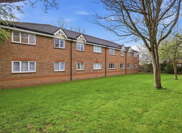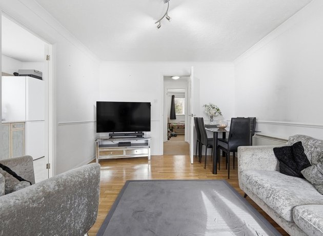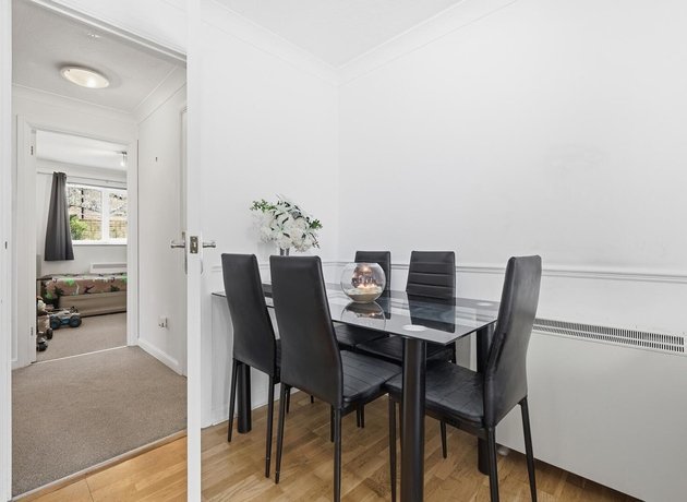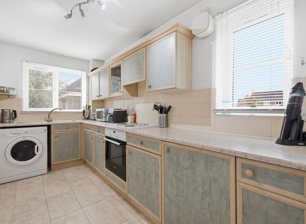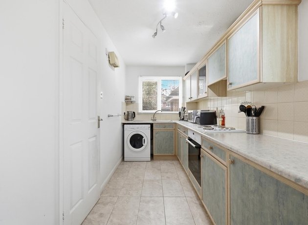 The bright, modern lounge/diner leads directly into the kitchen, also overlooking the green and benefitting from two windows allowing natural light throughout the day. A central hallway, with two storage cupboards ideal for coats and utility items, leads to a modern bathroom and two double bedrooms, both with views over the communal gardens to the rear and fitted storage.