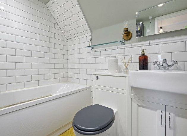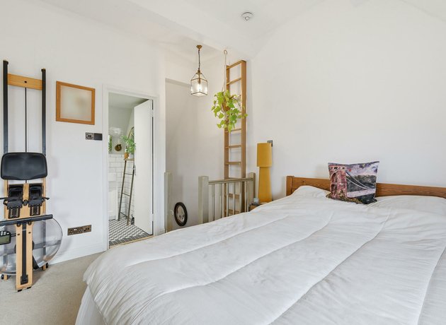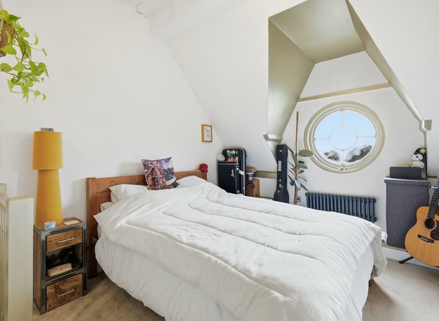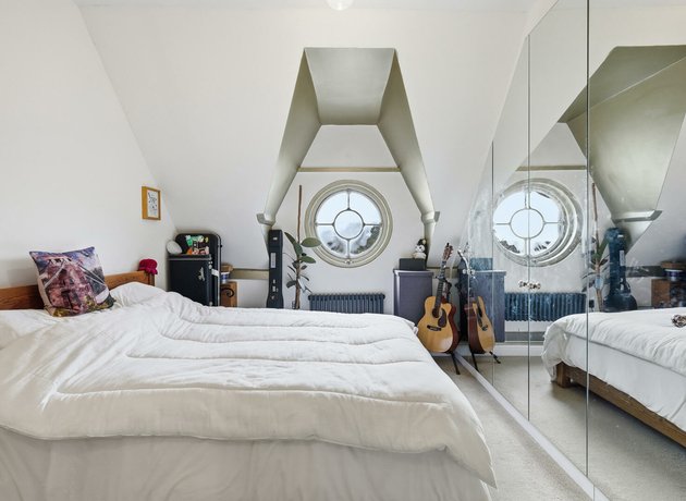 The bedroom is equally striking, featuring a school-house style radiator, sleek fitted glass wardrobes along one side and a stunning round feature window framing leafy views across Wanstead. A modern, fully tiled bathroom completes the internal accommodation.