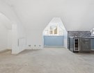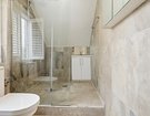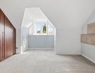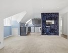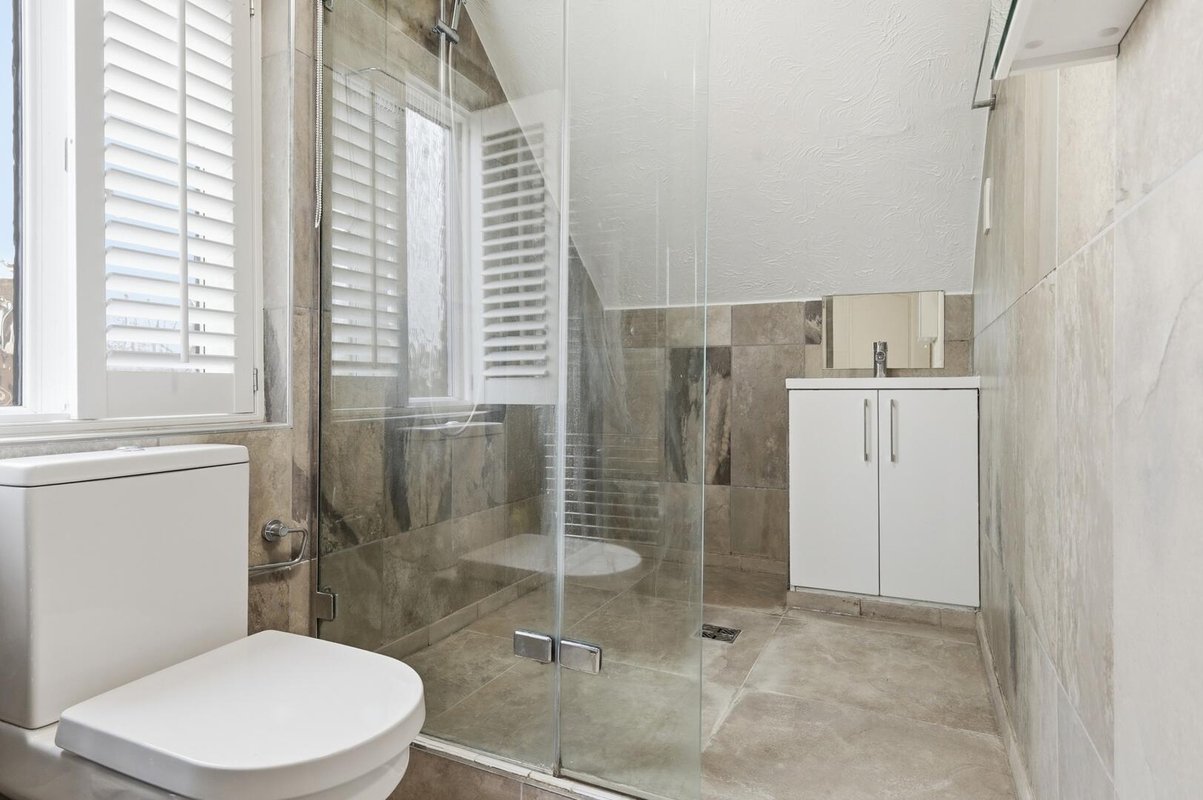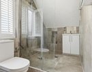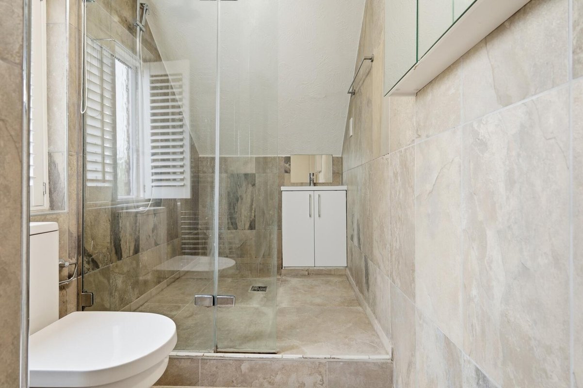 The bedroom is a well-proportioned double featuring custom-fitted wardrobes, served by a modern, fully tiled shower room with a luxurious double walk-in shower and contemporary vanity suite.