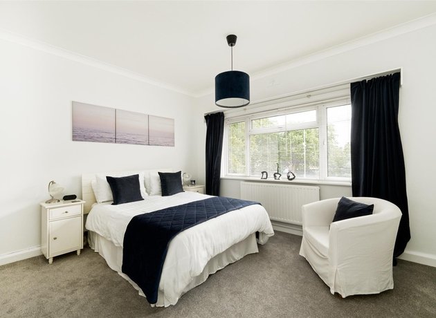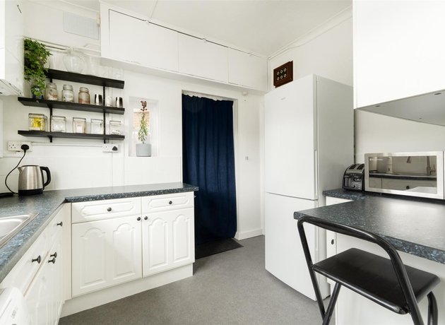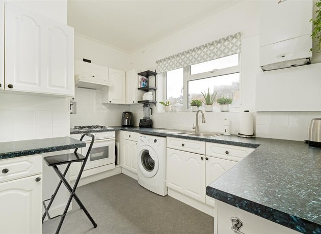 Accessed via its own private front door, this apartment boasts generous, newly redecorated rooms, with fresh flooring and carpeting throughout. As you step inside, you’re greeted by a bright and airy central entrance hall, complete with a large overhead skylight that floods the space with natural light. The apartment features two exceptionally spacious double bedrooms, each offering plenty of room to relax and unwind. The principal bedroom is particularly impressive, with wall-to-wall fitted wardrobes and ample space to easily accommodate a super-king bed and additional furniture. The kitchen is a practical yet stylish space, complete with a breakfast bar, a good range of storage, and utility areas. A convenient door at the rear provides easy access, allowing you to quickly remove kitchen waste without having to carry it through the home. The well-proportioned bathroom features a large bath with an overhead shower, perfect for a relaxing soak or a quick morning refresh.