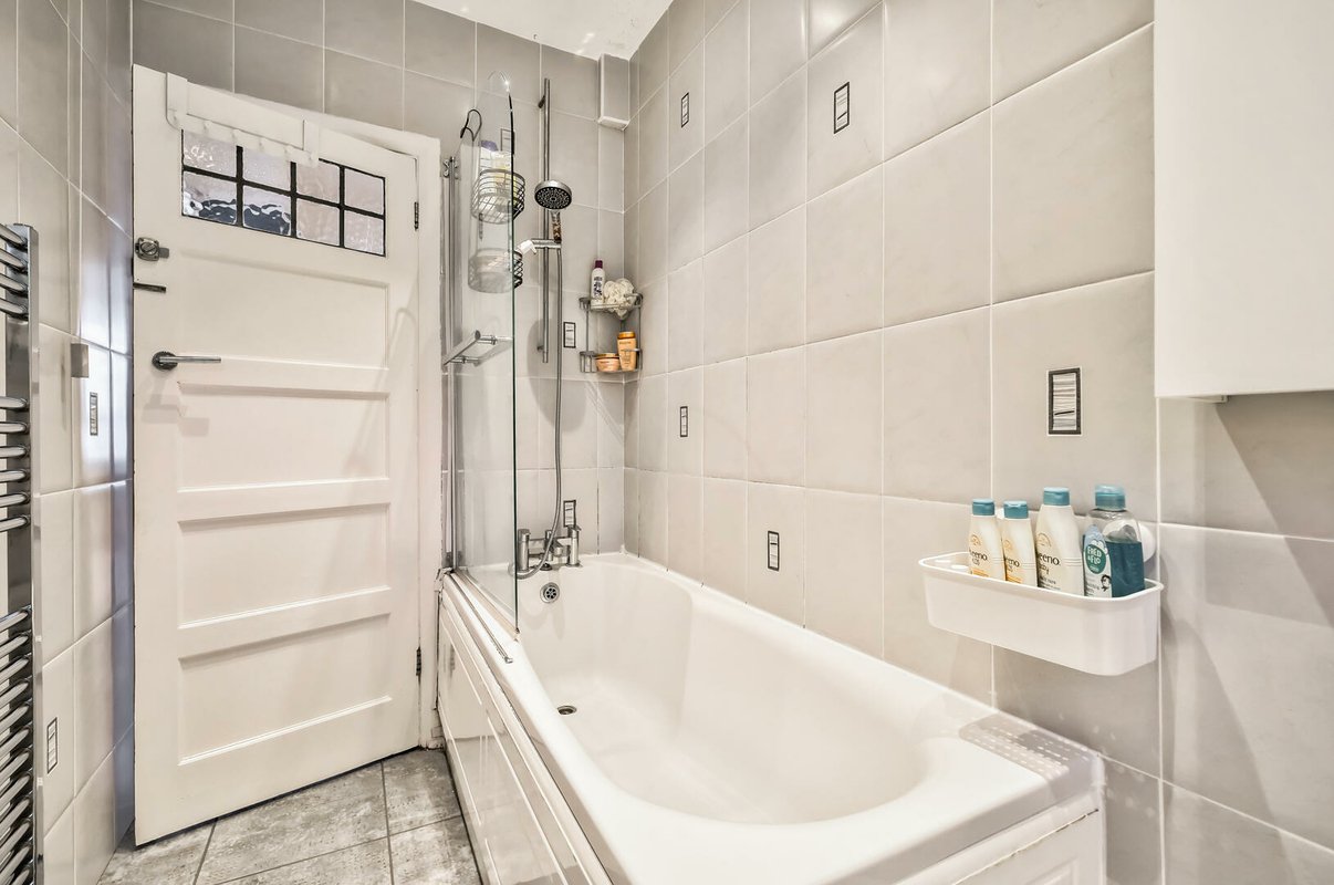Internally, the apartment is equally impressive. A spacious, square hallway with excellent built-in storage and a stylish school-style radiator sets the scene. The generous reception room features a large bay window, original picture rails, crisp white walls and a working log burner with a tiled hearth perfect for creating a cosy, homely feel.