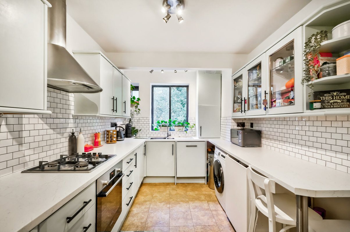The recently refurbished kitchen is a real standout; contemporary and practical in equal measure, with sleek white cabinetry, contrasting black-grouted metro tiles, ample worktop space and quality finishes throughout.