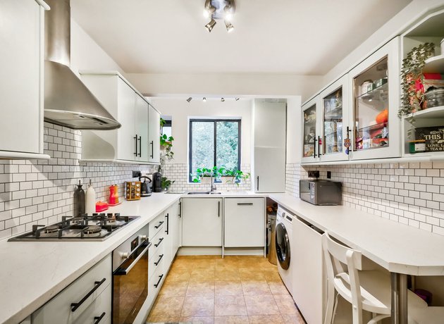 The recently refurbished kitchen is a real standout; contemporary and practical in equal measure, with sleek white cabinetry, contrasting black-grouted metro tiles, ample worktop space and quality finishes throughout.