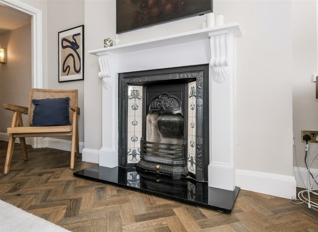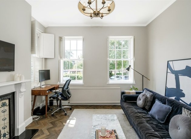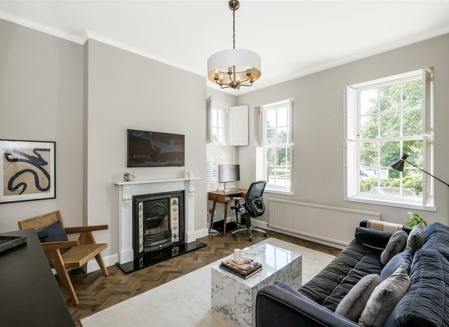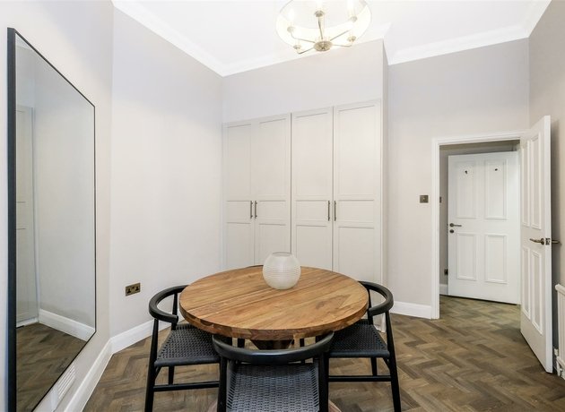 Built within the Georgian period, high ceilings and sash style windows feature throughout the apartment’s spacious accommodation, providing a sense of grandeur and elegance. To access the apartment, you alight a small set of steps into the communal entrance hall where the apartments door is located and, upon stepping inside, the bright dual aspect sitting room can be fully appreciated. A stunning, herringbone patterned floor runs through the majority of the accommodation, leading from the sitting room, down the "L shaped" hallway providing good storage and into the separate dining area with additional bespoke storage. Both the double bedroom and kitchen enjoy views over the communal grounds and the kitchen is fitted with a modern range of cabinets complemented by wooden work surfaces and contrasting tiled splash backs. The bathroom is especially large for the size of apartment, offering plenty of room for a bath with a huge storage cupboard as you enter.