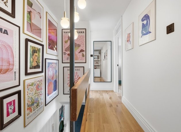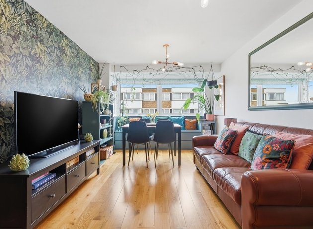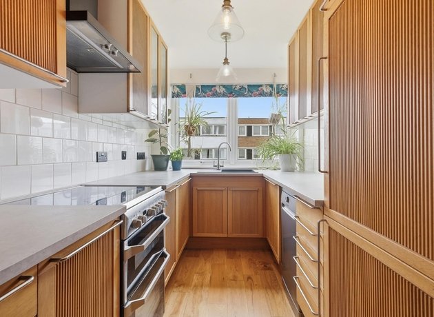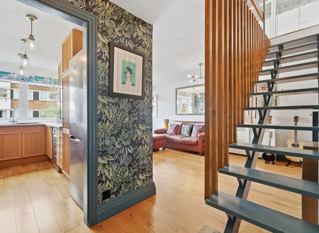 The property features fitted, sleek cabinetry throughout, commencing with the contemporary galley kitchen, showcasing plenty of space for appliances and generous worktop space. The large windows at the end of the kitchen flood the space with light and provide a pleasant outlook. The spacious open-plan living and dining area is a standout feature, boasting warm wooden flooring, a statement feature wall, and ample room for both relaxation and hosting guests. The dining space sits perfectly by the window, creating a bright and inviting setting, complemented by tasteful décor and greenery.