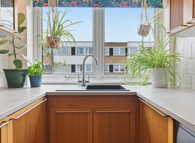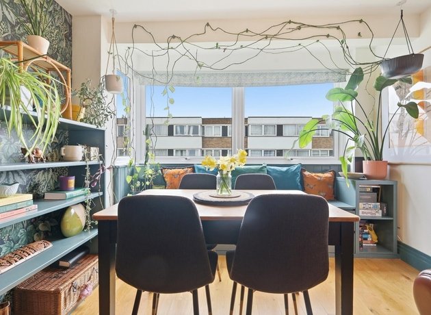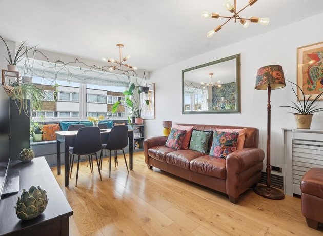 The property features fitted, sleek cabinetry throughout, commencing with the contemporary galley kitchen, showcasing plenty of space for appliances and generous worktop space. The large windows at the end of the kitchen flood the space with light and provide a pleasant outlook. The spacious open-plan living and dining area is a standout feature, boasting warm wooden flooring, a statement feature wall, and ample room for both relaxation and hosting guests. The dining space sits perfectly by the window, creating a bright and inviting setting, complemented by tasteful décor and greenery.