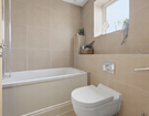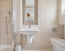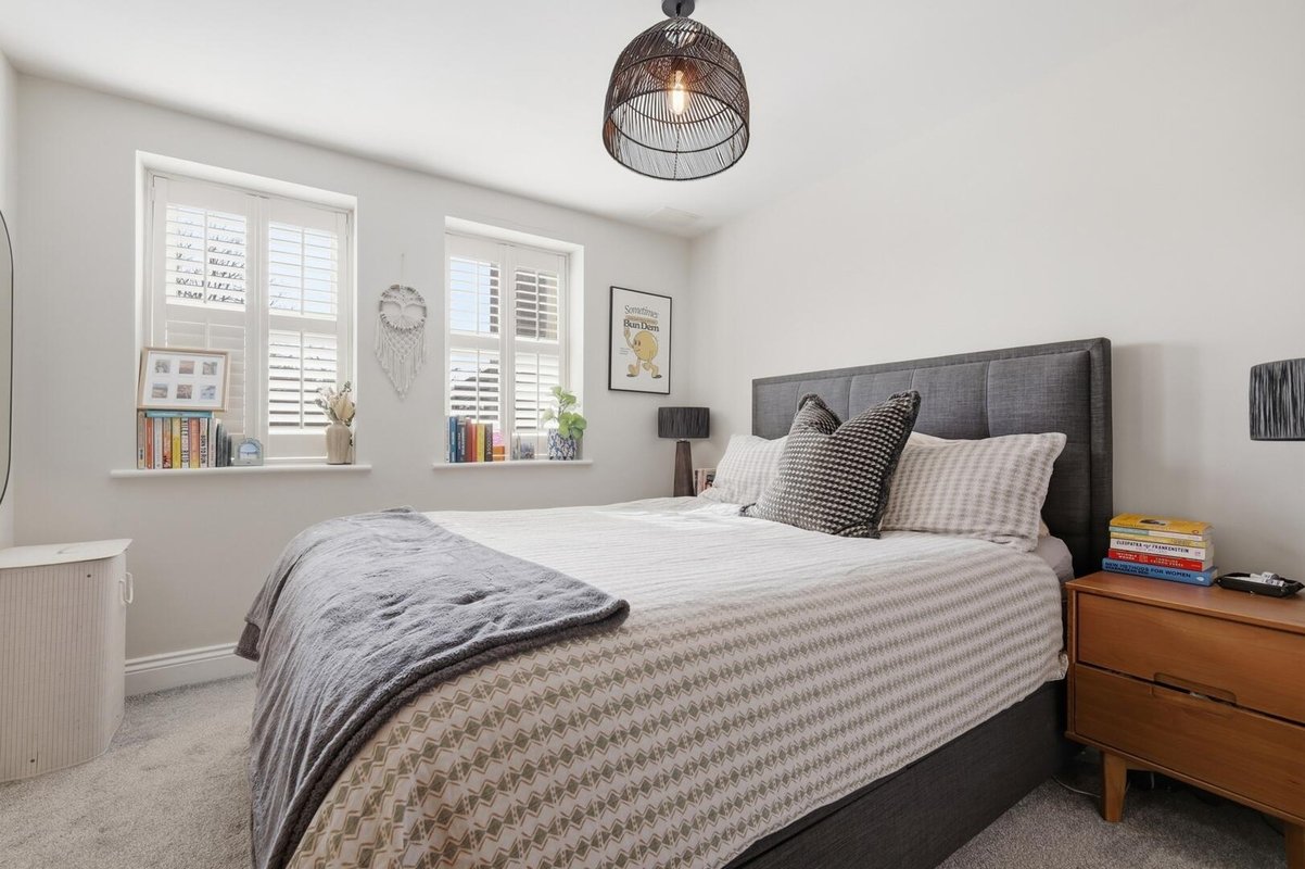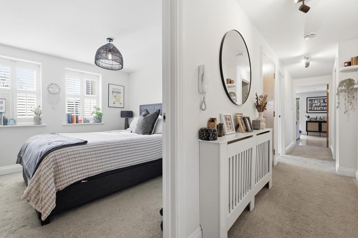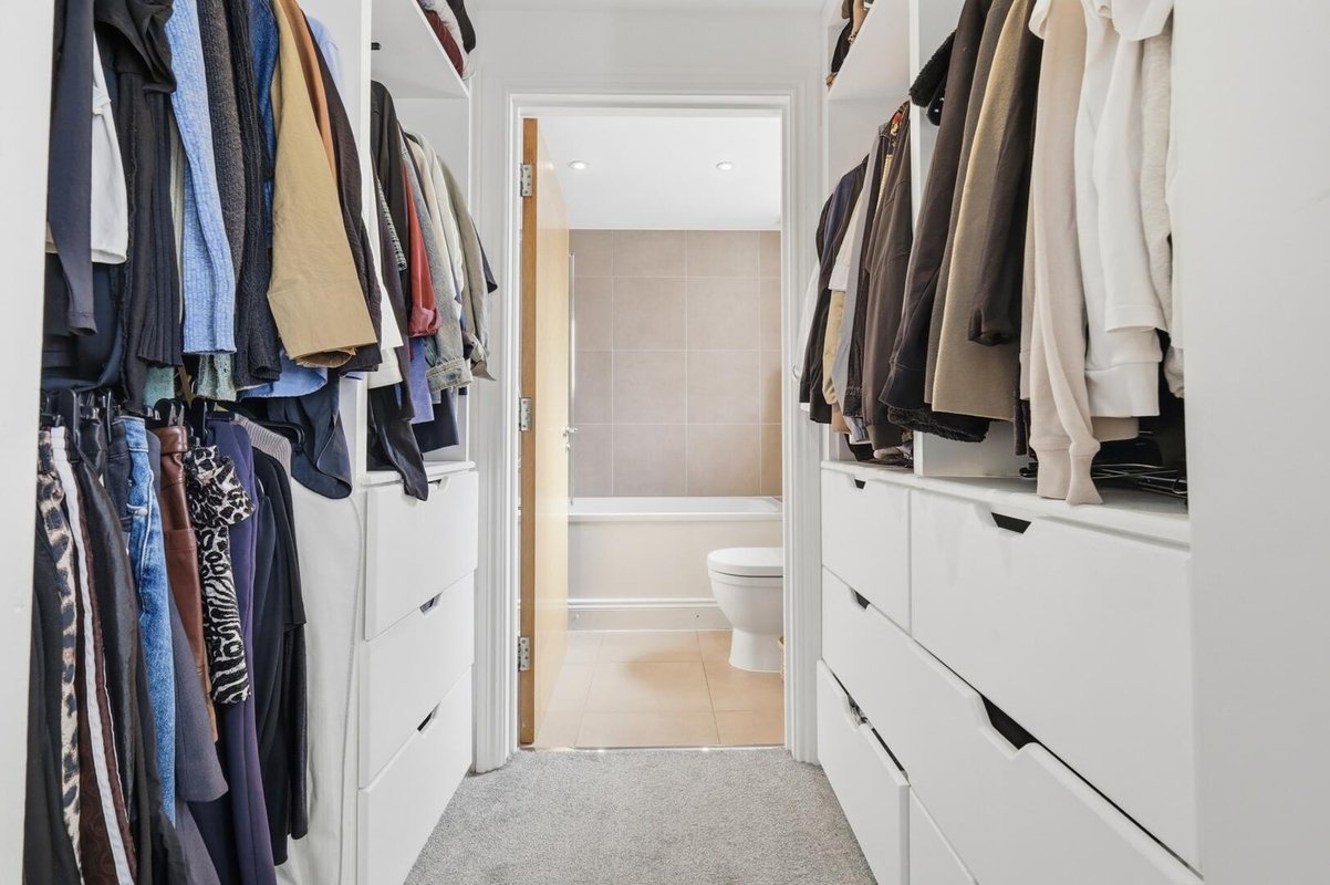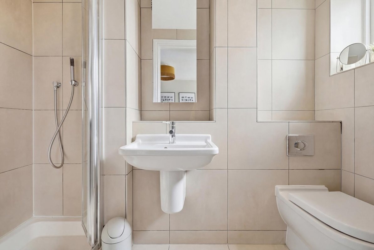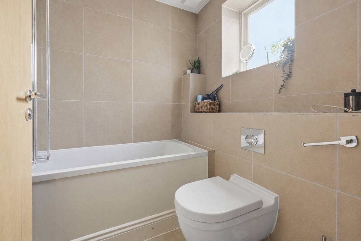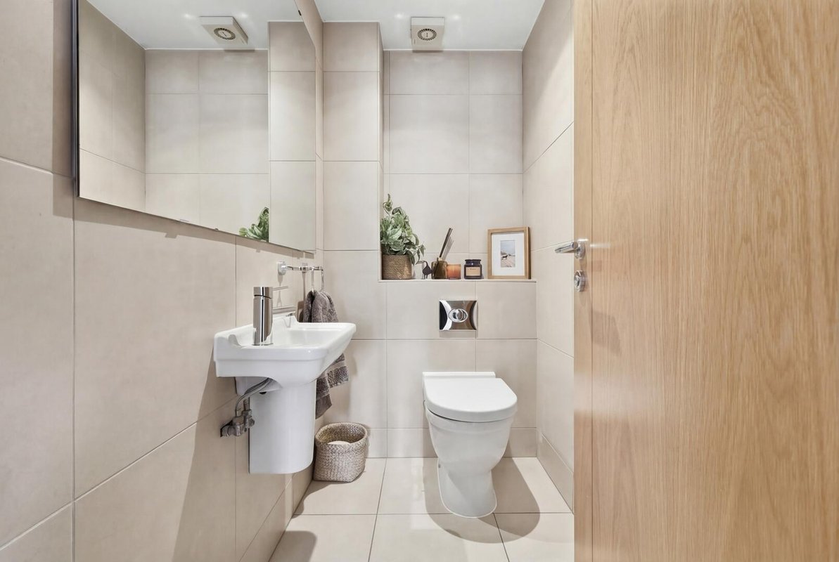 Located on the second floor, both double bedrooms benefit from elegant plantation shutters and fully tiled en-suite bathrooms, making the layout ideal for professional sharers or as a high-quality investment. The principal suite is further enhanced by a dedicated dressing area, offering an abundance of storage and hanging space. A separate guest W.C. is conveniently positioned off the entrance hall.