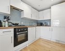 The kitchen features sleek high-gloss cabinetry, wooden style worktops and duck egg blue splashback tiling. Integrated appliances, include a fridge/freezer, dishwasher, oven, induction hob and extractor.
