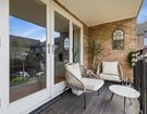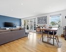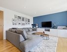 At the heart of the home lies a striking open-plan living space, where warm wood flooring, crisp white walls and a bold feature wall combine to create a sophisticated yet inviting environment. This versatile area comfortably accommodates both relaxed seating and formal dining, while doors open onto a private west-facing balcony.