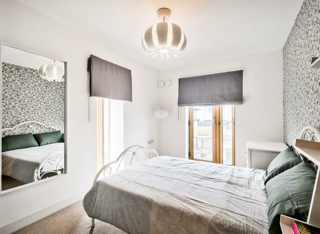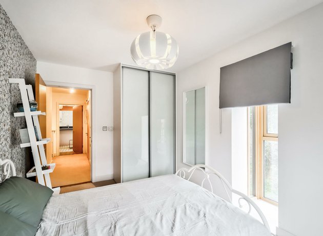 The bedroom is equally impressive, featuring a floor-to-ceiling box window that adds architectural interest, a Juliette balcony for fresh air, and sleek fitted wardrobes that maximise storage without compromising on style.