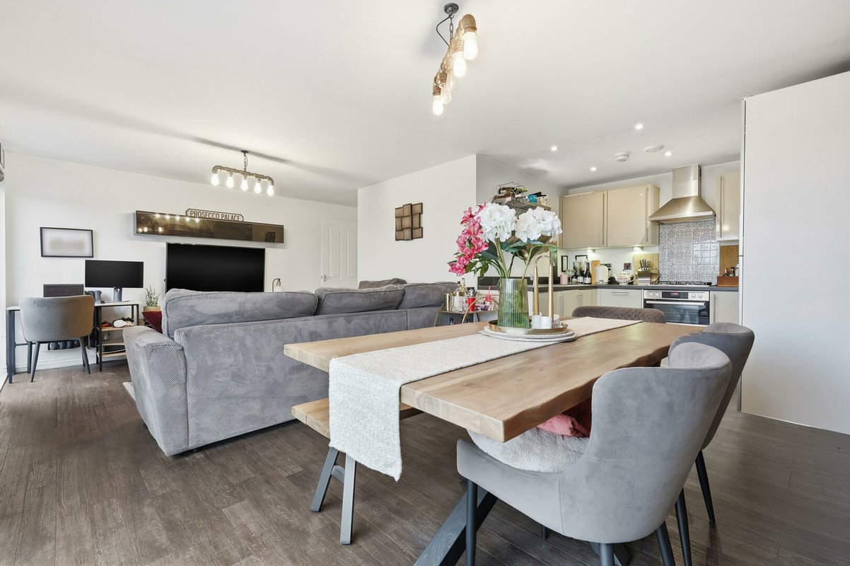 The apartment is immaculately presented throughout and is accessed via a spacious entrance hallway that flows seamlessly into a bright and generous open-plan living and dining area.