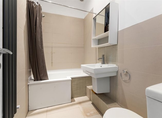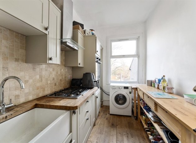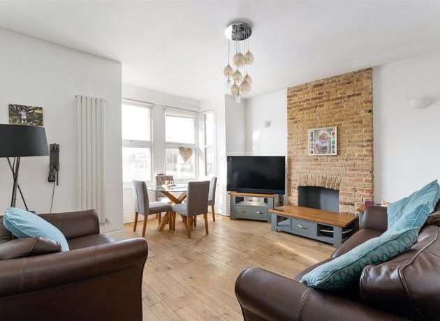 Stepping into a central entrance hall, a fresh white colour palette that runs throughout the home creates a crisp, contemporary feel throughout and helps to accentuate the property's naturally high ceilings. Offering plenty of room for a lounge and dining set, the spacious living/dining room features a striking exposed brick chimney breast, wooden flooring and large bay window. Conveniently located opposite the dining space, the separate kitchen offers a run of units including integrated ovens and a large butler sink whilst the opposite side, currently occupied by a run of freestanding units, could be fitted with further units, a breakfast bar left open to allow for a greater feeling of space. There are two double bedrooms with period style radiators, ideal for friends or family members looking to buy together or as an ideal investment opportunity. There is also a contemporary bathroom with L shaped bath and shower overhead.