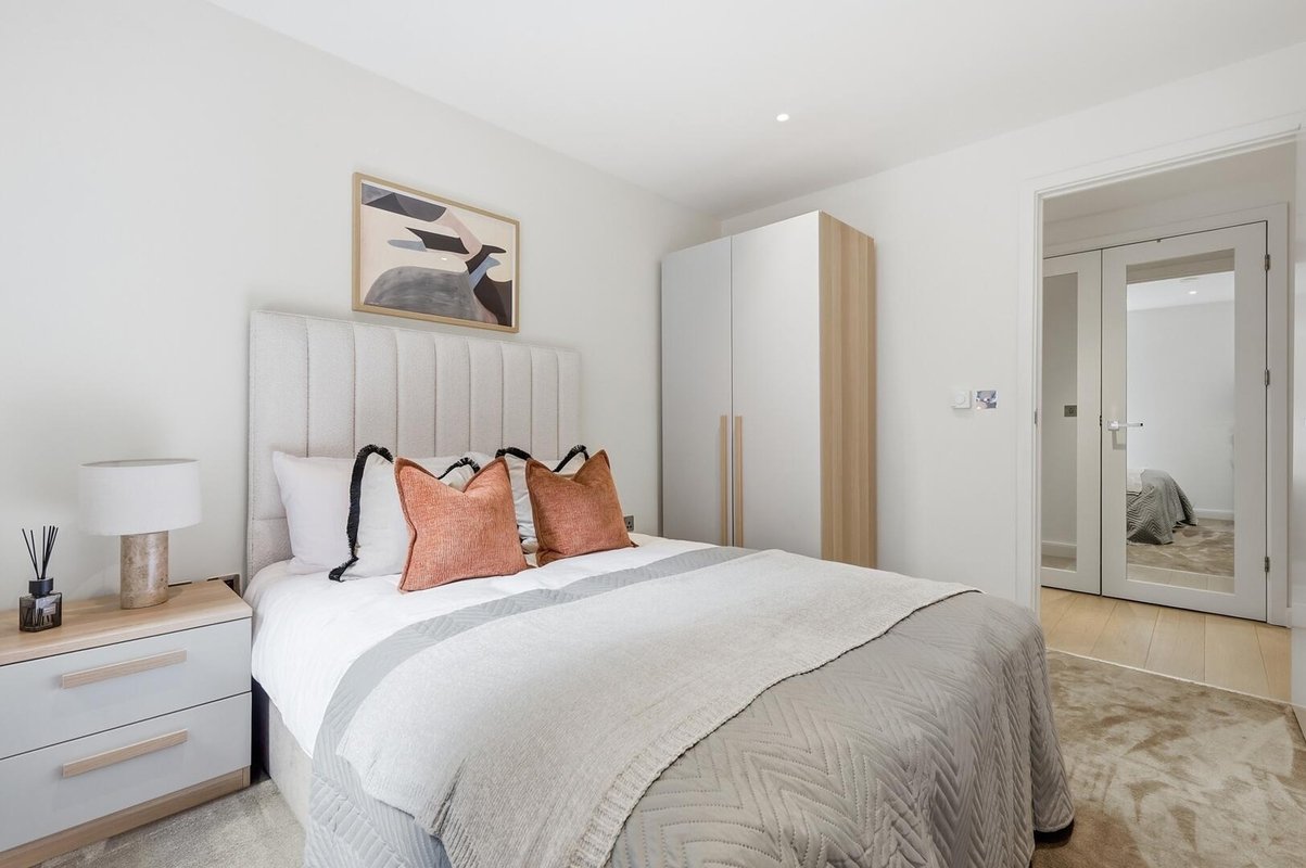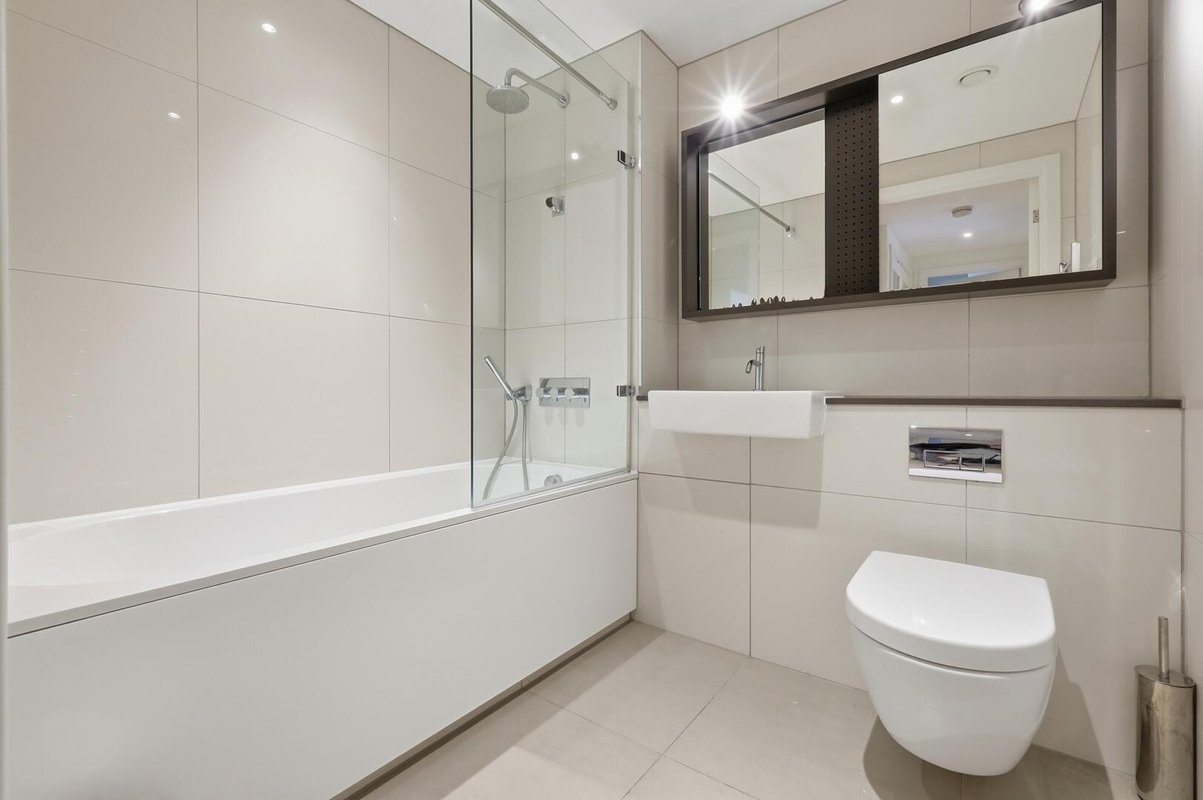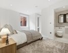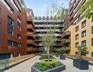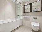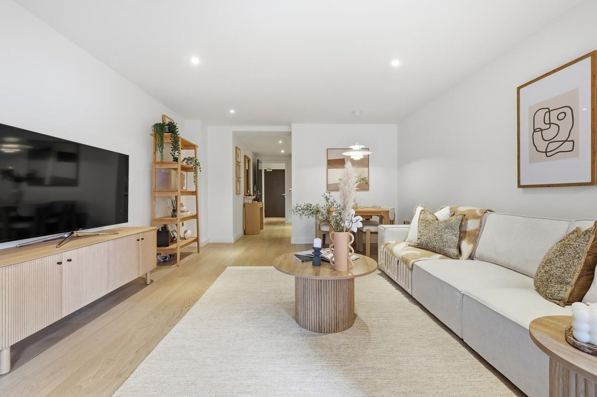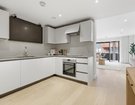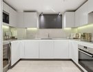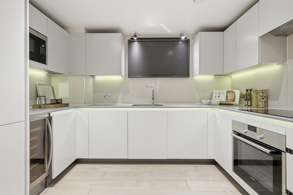 The apartment then flows through in a contemporary, high gloss, fully fitted kitchen, with stylish under unit lighting and low maintenance, cream splash backs. The layout of the apartment creates a slight and practical separation between the kitchen and living space, which is generous in size and large enough to comfortably house a sofa and dining table and benefits from French doors opening onto a spacious balcony. Other features include an energy-efficient heating system, underfloor heating, lift access, concierge facilities, leisure space and a large communal roof terrace.