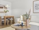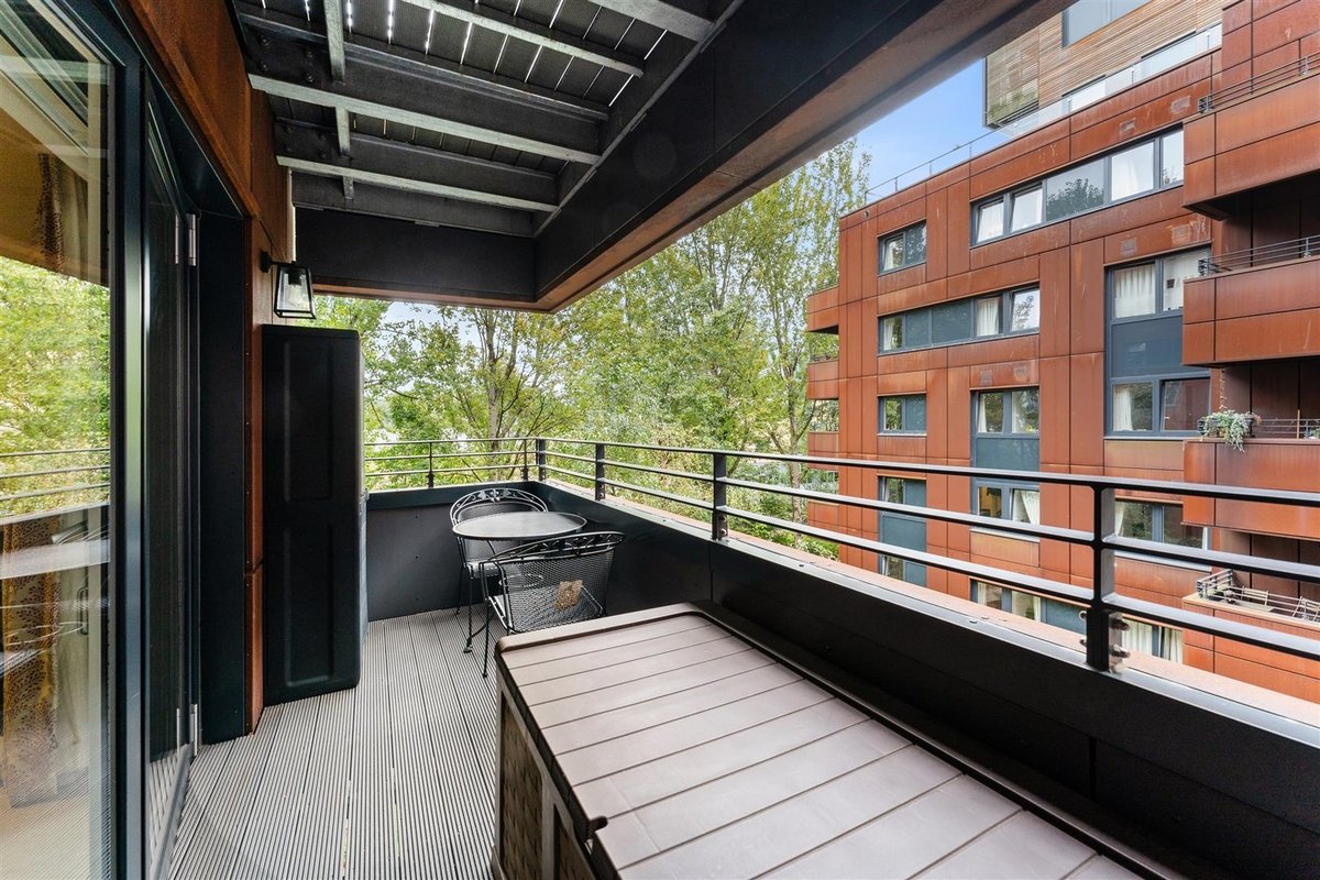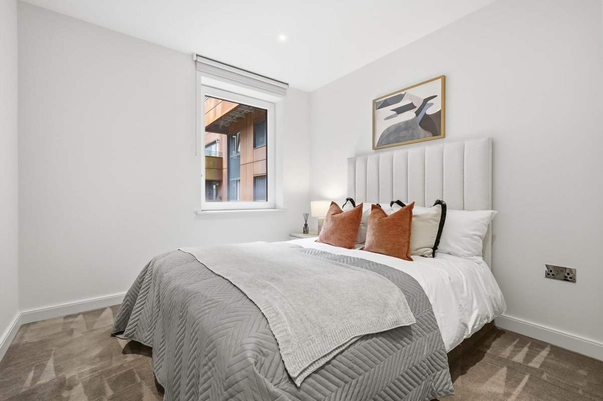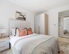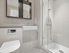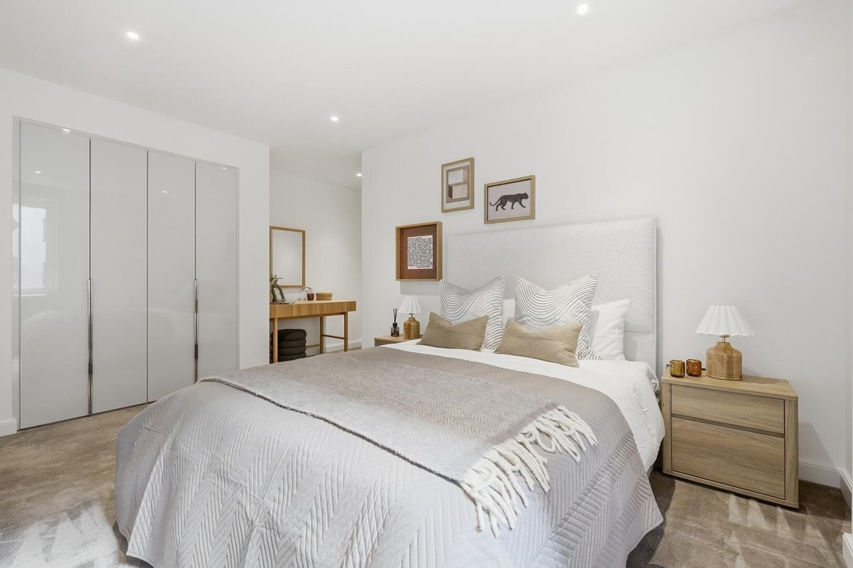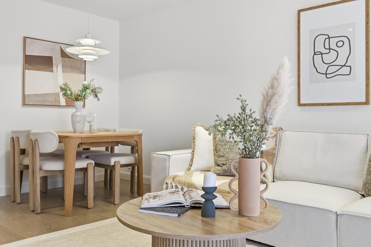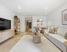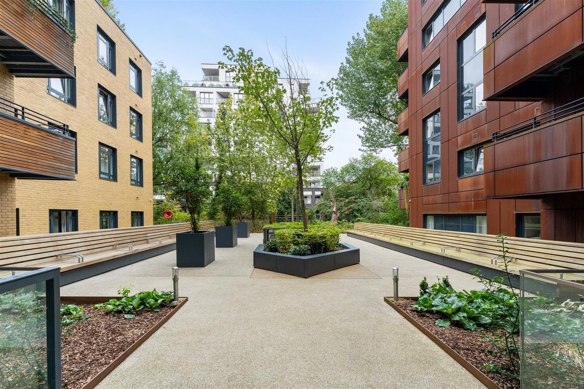 The apartment then flows through in a contemporary, high gloss, fully fitted kitchen, with stylish under unit lighting and low maintenance, cream splash backs. The layout of the apartment creates a slight and practical separation between the kitchen and living space, which is generous in size and large enough to comfortably house a sofa and dining table and benefits from French doors opening onto a spacious balcony. Other features include an energy-efficient heating system, underfloor heating, lift access, concierge facilities, leisure space and a large communal roof terrace.