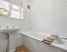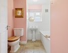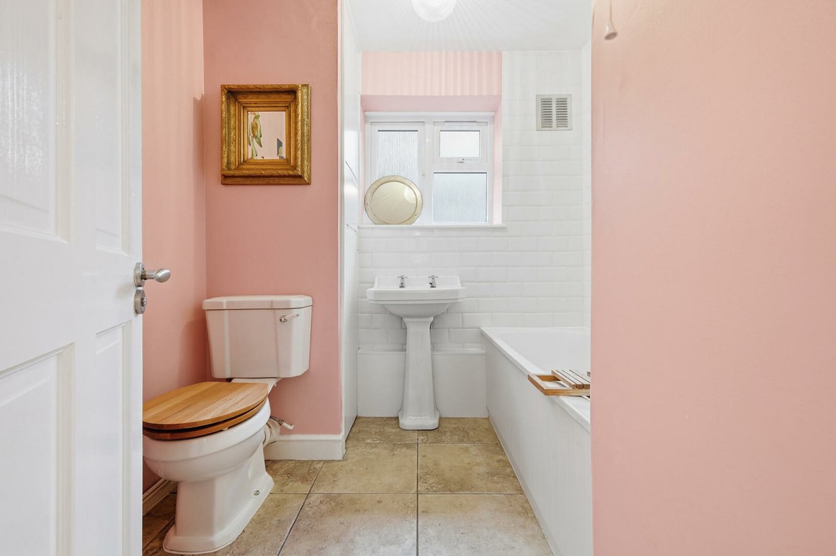 All three bedrooms are generously sized, with the principal bedroom enjoying fitted wardrobes for a seamless finish. The contemporary bathroom continues the stylish aesthetic with a white suite, white mono tiles and a chic creamy-pink feature wall.