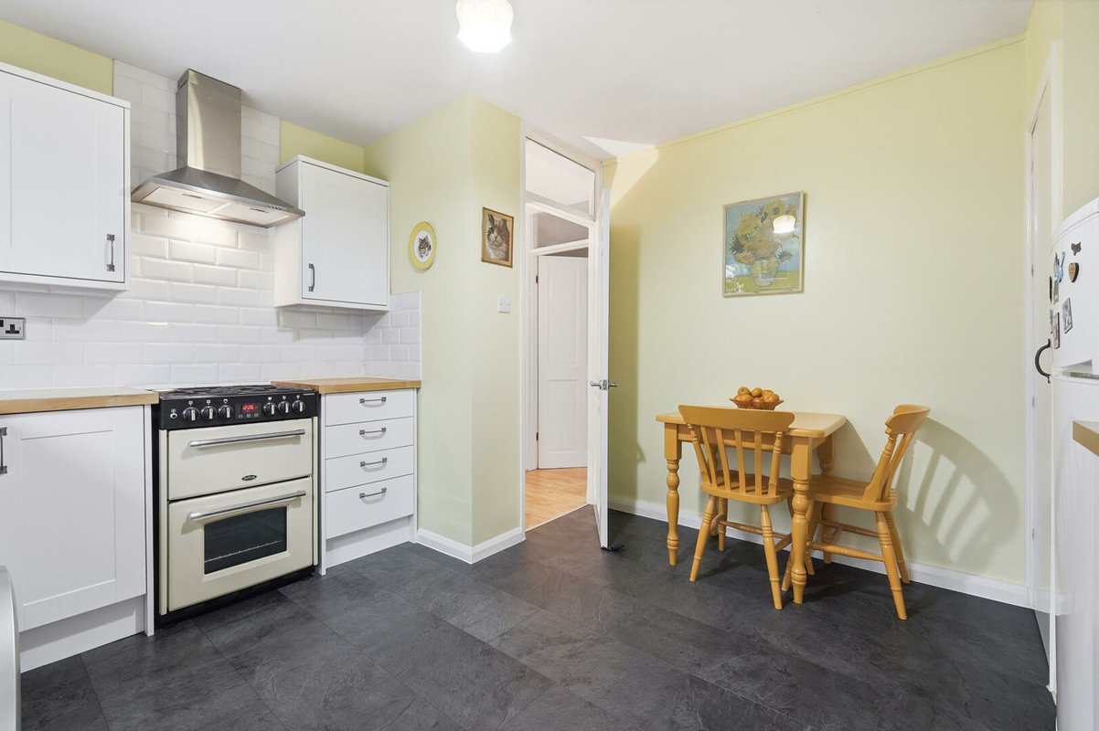 The large kitchen/diner features sleek white cabinetry, solid wooden worktops and a layout built for both cooking and socialising. From here, doors open directly onto your own private walled garden, which is a beautifully presented outdoor haven framed by lush greenery, mature shrubs and two handy storage sheds. Beyond this sits the expansive, tranquil communal gardens, offering even more space to unwind.