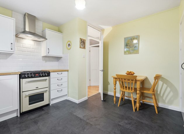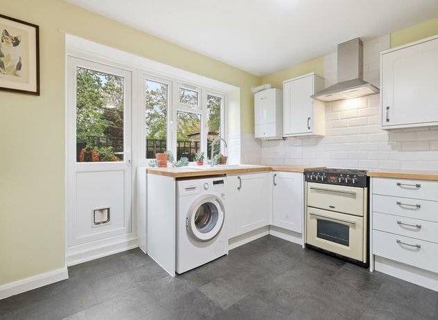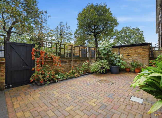 The large kitchen/diner features sleek white cabinetry, solid wooden worktops and a layout built for both cooking and socialising. From here, doors open directly onto your own private walled garden, which is a beautifully presented outdoor haven framed by lush greenery, mature shrubs and two handy storage sheds. Beyond this sits the expansive, tranquil communal gardens, offering even more space to unwind.