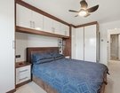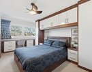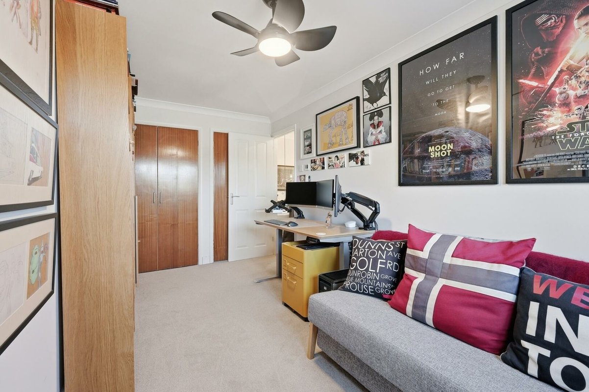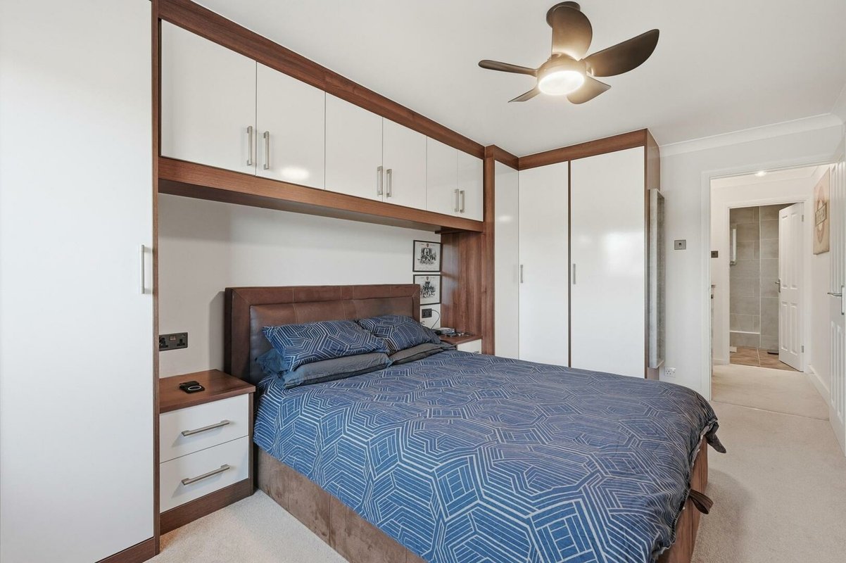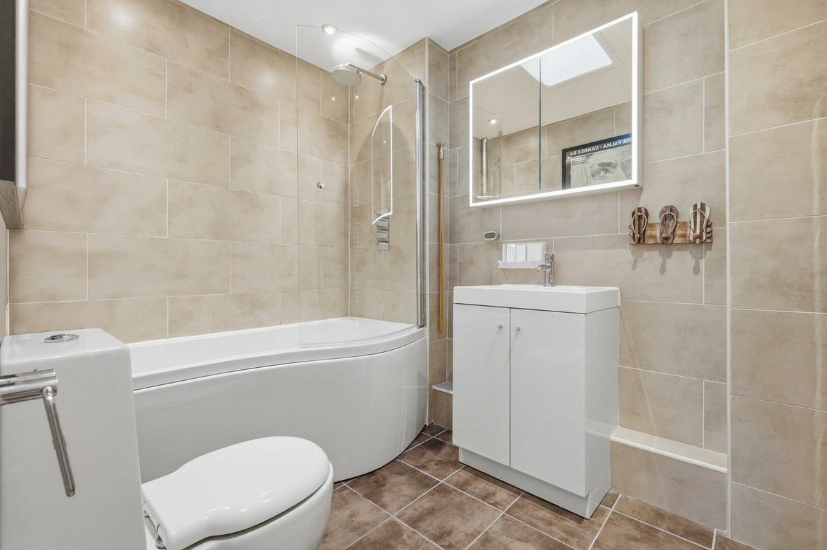 Upstairs, two generous double bedrooms provide fitted wardrobes and excellent storage, maintaining the home’s streamlined feel. The fully tiled bathroom is finished in elegant deep cream tones and features a modern white suite, over-bath shower, and a distinctive tapless bath, creating a calm, spa-inspired environment.