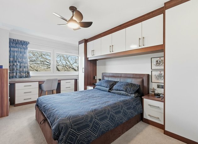 Upstairs, two generous double bedrooms provide fitted wardrobes and excellent storage, maintaining the home’s streamlined feel. The fully tiled bathroom is finished in elegant deep cream tones and features a modern white suite, over-bath shower, and a distinctive tapless bath, creating a calm, spa-inspired environment.