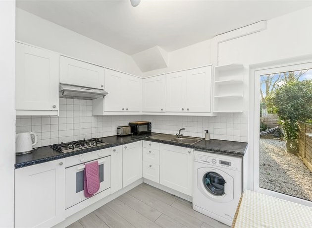 The flat is accessed via a shared front door and communal hallway, with the apartment positioned on the ground floor. Once inside, one of the first rooms you encounter is the spacious kitchen/diner – a sociable space fitted with classic shaker-style units and a glazed door opening directly onto the private garden, which floods the room with natural light. Next door, the recently installed bathroom features a shower over the bath and a window for proper ventilation. To the rear of the flat sits a well-sized double bedroom, complete with French doors that also lead out to the garden.