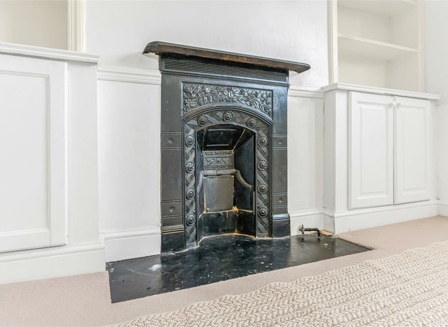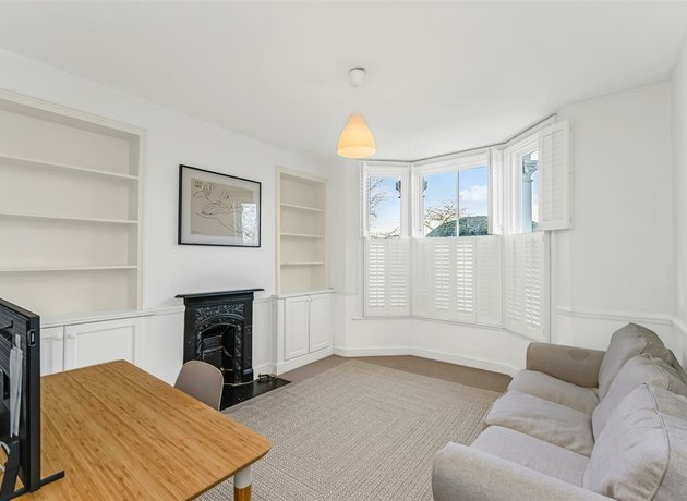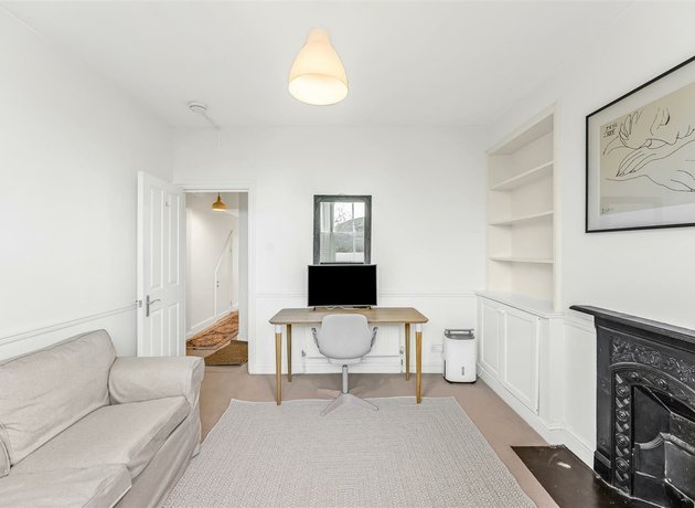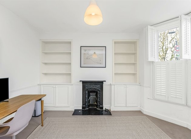At the front, the bright reception room is finished with a large bay window fitted with plantation shutters, a central fireplace, and bespoke shelving and storage to either side.