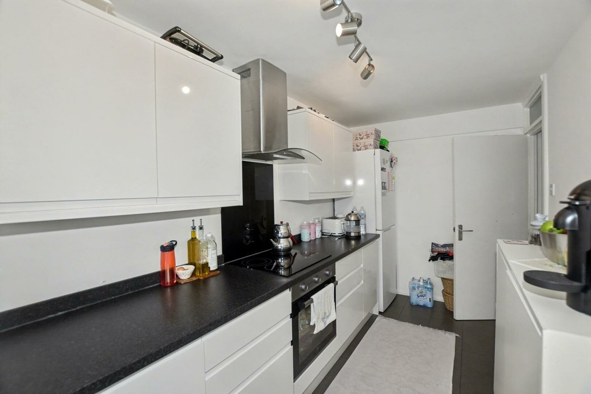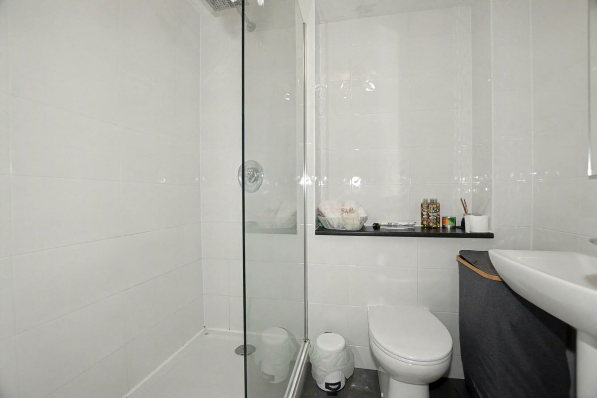 Inside, the property enjoys an airy feel throughout thanks to large windows that flood the space with natural light. The apartment features two well-sized double bedrooms, a bright and spacious lounge/diner ideal for entertaining, and a sleek contemporary kitchen positioned conveniently off the living area. A modern, fully tiled shower room with a large walk-in cubicle and a complimentary white suite completes the accommodation, while a central hallway provides useful built-in storage.