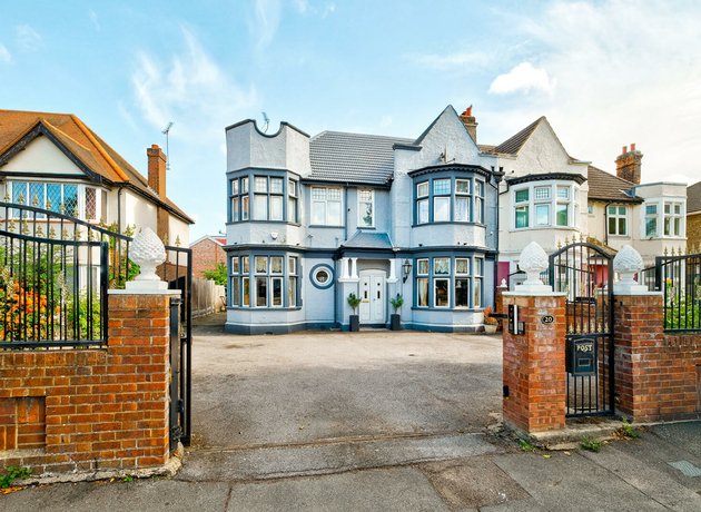 Behind secure gates, the property presents with striking curb appeal, including a turret-style side elevation and a spacious front garden with extensive off-street parking.