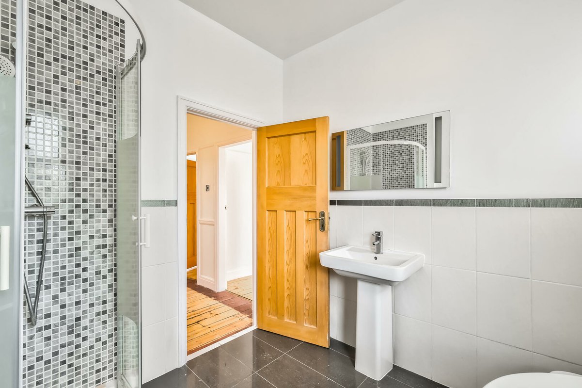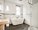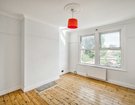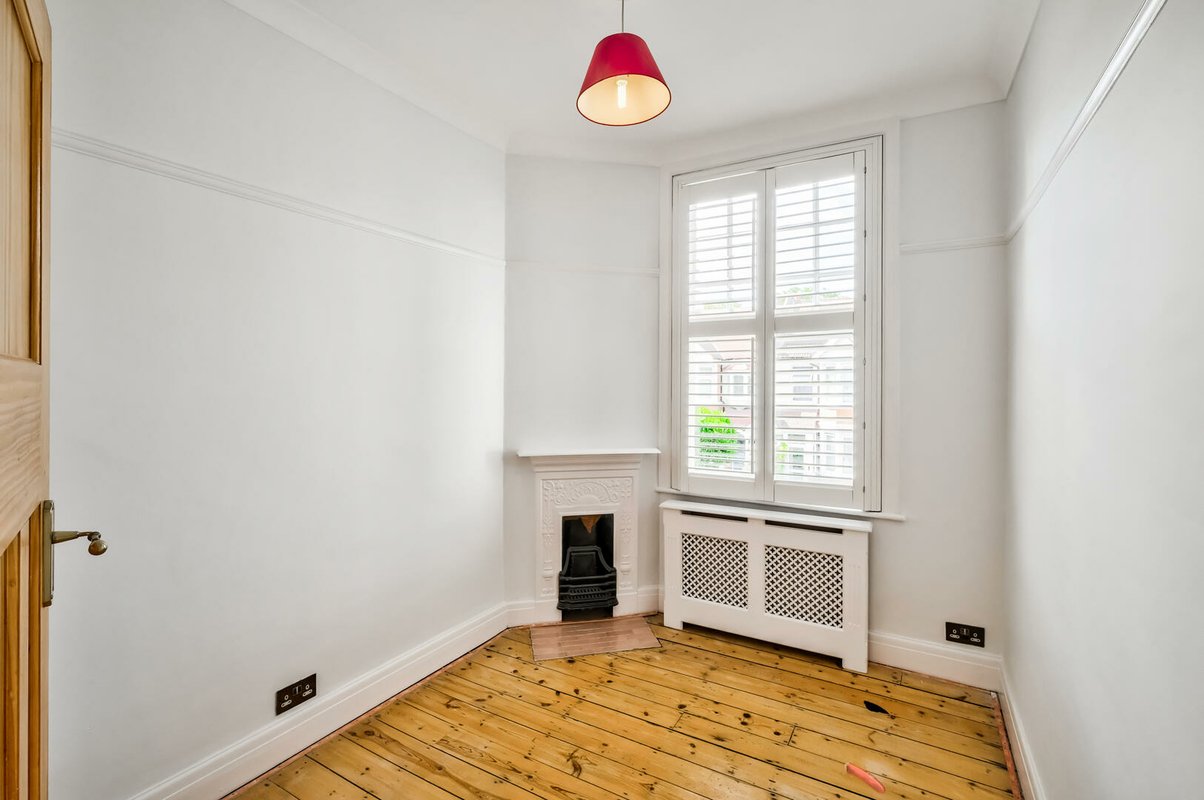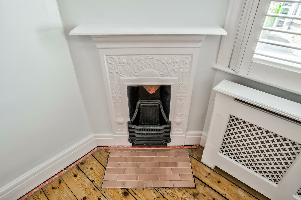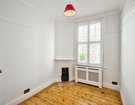 Upstairs, you’ll find three well-proportioned bedrooms: two doubles and a generous single. The principal bedroom benefits from built-in wardrobes, while the third bedroom features a charming original fireplace. Exposed floorboards and freshly painted white walls throughout the first floor add rustic warmth and a blank canvas for personal touches. The modern family bathroom is spacious and stylish, with a standalone bath, separate shower enclosure, grey floor tiles, and crisp white wall tiling with a grey tiled shower feature wall for added elegance.