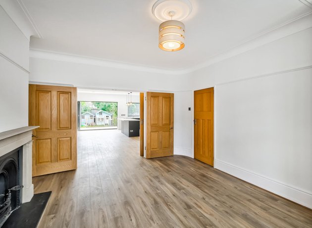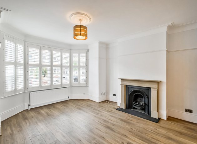The front reception room is bright and spacious, featuring a stunning shuttered bay window, fireplace, and brand new flooring that flows seamlessly through to the rear of the home.