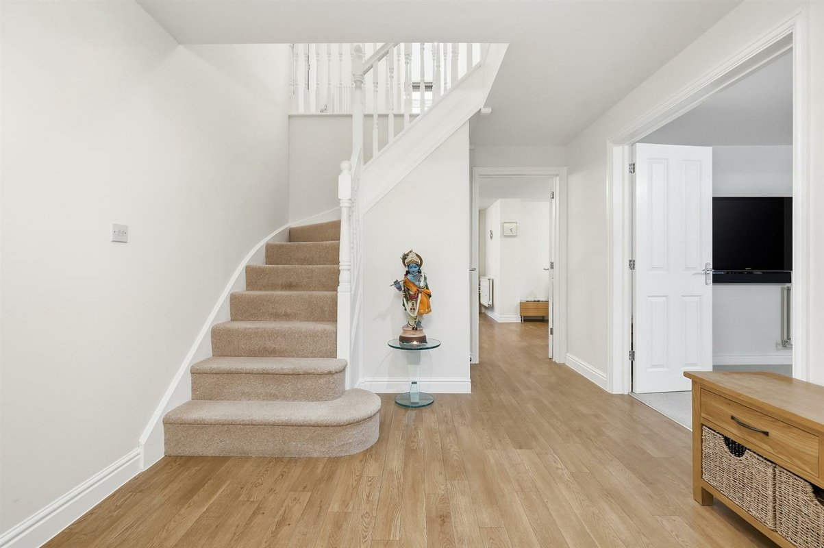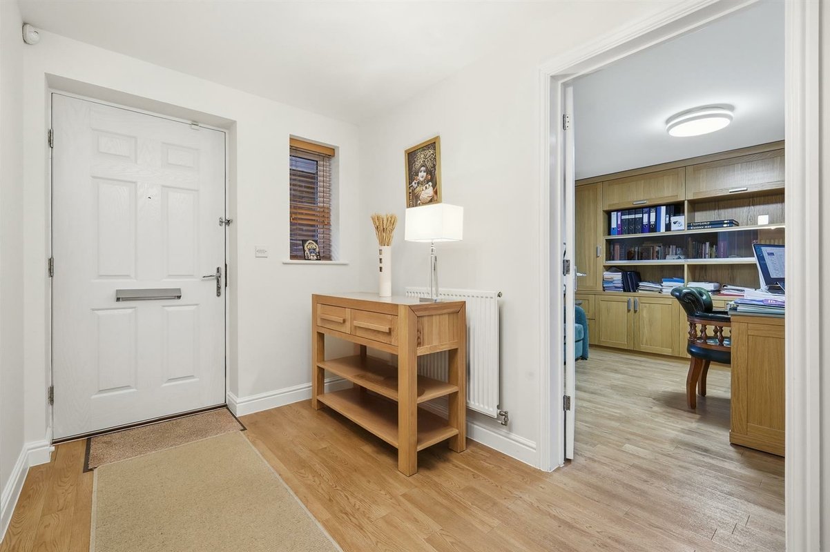 The property opens into a wide and welcoming entrance hall, immediately setting a sense of space. To the front, a well-proportioned formal reception room enjoys double doors onto the garden, while a dedicated home office offers a practical work-from-home solution. A guest cloakroom completes the ground floor layout.