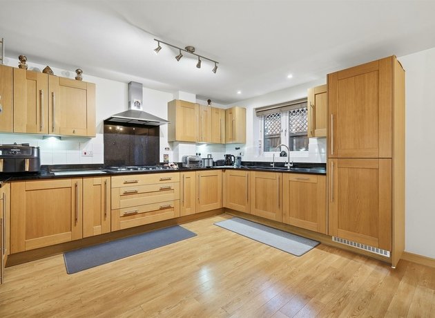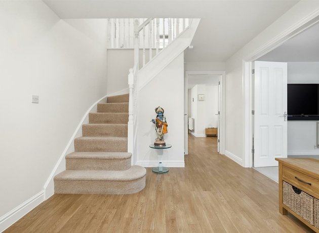 Upstairs, a bright landing leads to four spacious double bedrooms, all featuring bespoke full-height fitted wardrobes. A sleek en-suite shower rooms services one double rooms, while the principal suite enjoys a walk-in dressing area and a spacious en-suite with both bath and separate shower. A well-appointed family bathroom, also offering bath and shower, serves the remaining bedrooms.