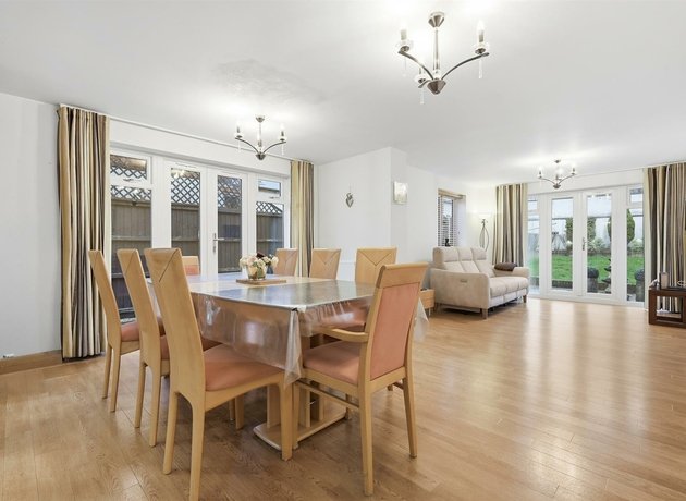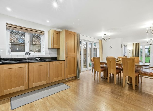 To the rear sits the real focal point of the home; a 33’10” open-plan kitchen, dining and family space designed for modern living. With two sets of doors opening onto the wrap-around garden, this room is filled with natural light and offers excellent flexibility for entertaining or relaxed day-to-day family life. The contemporary kitchen is positioned to one end, with a separate utility room keeping appliances and storage neatly out of sight.