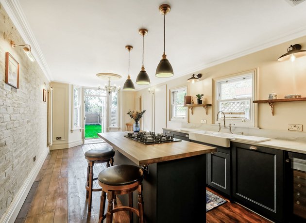 Beneath the main floor, a refurbished cellar adds valuable, versatile space to the home, lending itself perfectly as a home office or gym. Nearby, a charming ground-floor W/C showcases a piece of the home's history as the original Victorian tiles discovered in the cellar have been thoughtfully repurposed as a splashback around the washbasin, and set within a colour scheme that honours their legacy. At the heart of the home lies a truly stunning kitchen/diner. Rich navy cabinetry sits beneath a mix of crisp white quartz and warm oak worktops, framing a traditional butler sink, accompanied by stunning brushed gold fittings. A central island offers additional preparation space and informal dining, while double-glazed sash windows and French doors, all south-facing, flood the space with natural light. Exposed brickwork, original flooring, and high-end integrated appliances complete this show-stopping room, which opens directly onto the landscaped rear garden.