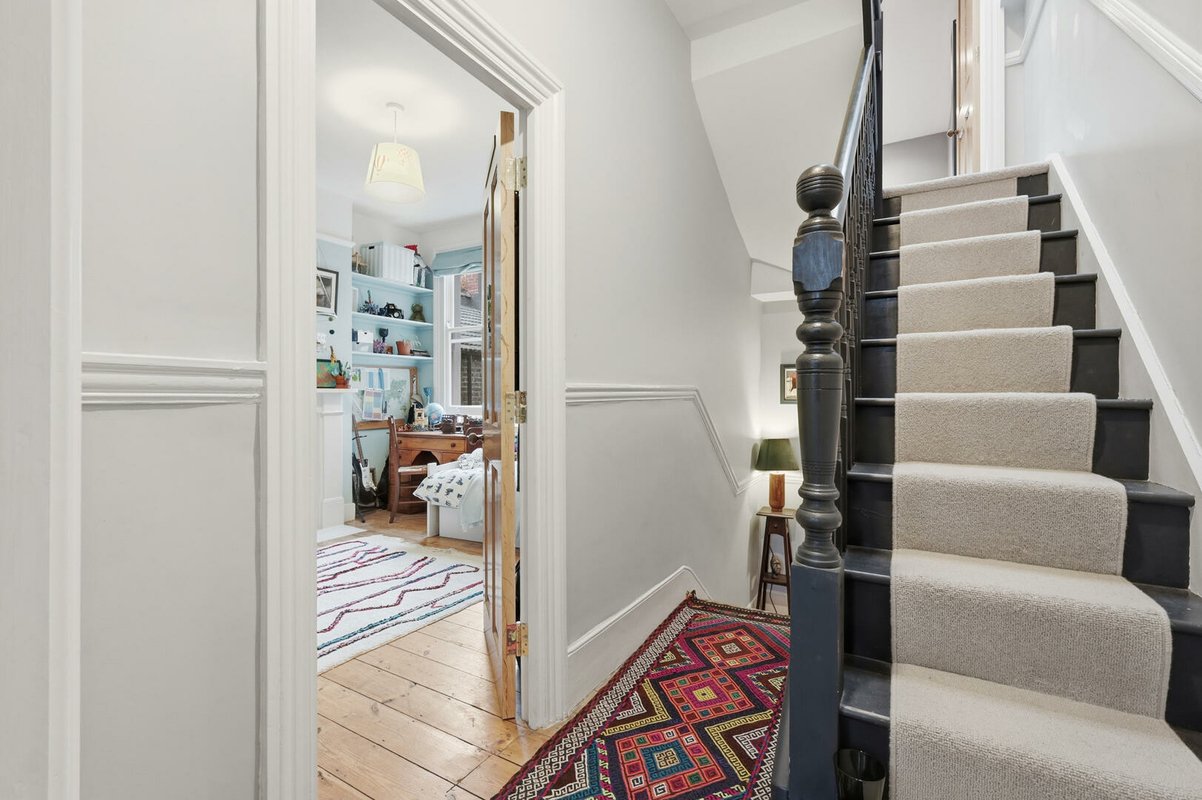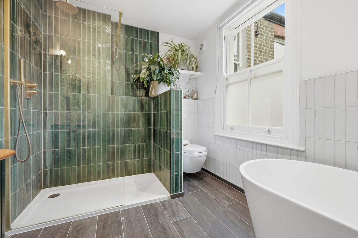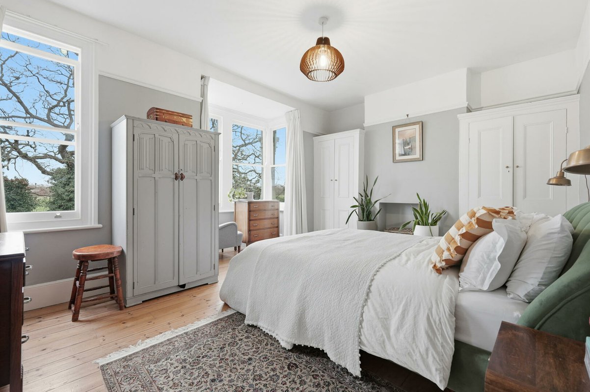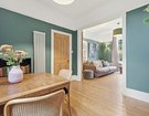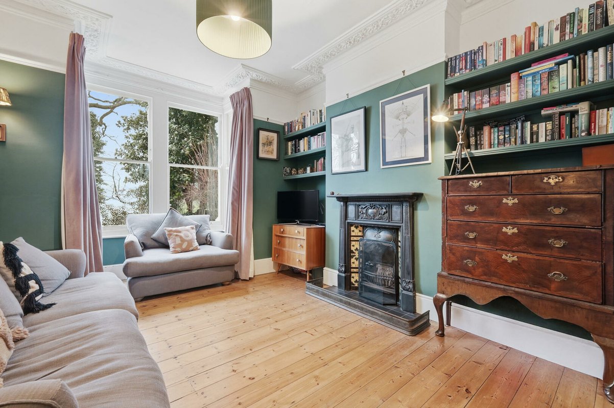 Upon entering, a wide and welcoming hallway sets the tone, retaining much of the home’s original character and exposed timber floorboards. This sense of grandeur continues into the beautifully proportioned double reception room, where original floorboards, detailed cornicing and handsome Victorian fireplaces are complemented by soothing green walls up to the picture rails, with crisp white above to accentuate the impressive ceiling heights. The ground floor has been cleverly reconfigured to suit modern living, featuring a generous utility room and a practical downstairs cloakroom.
