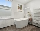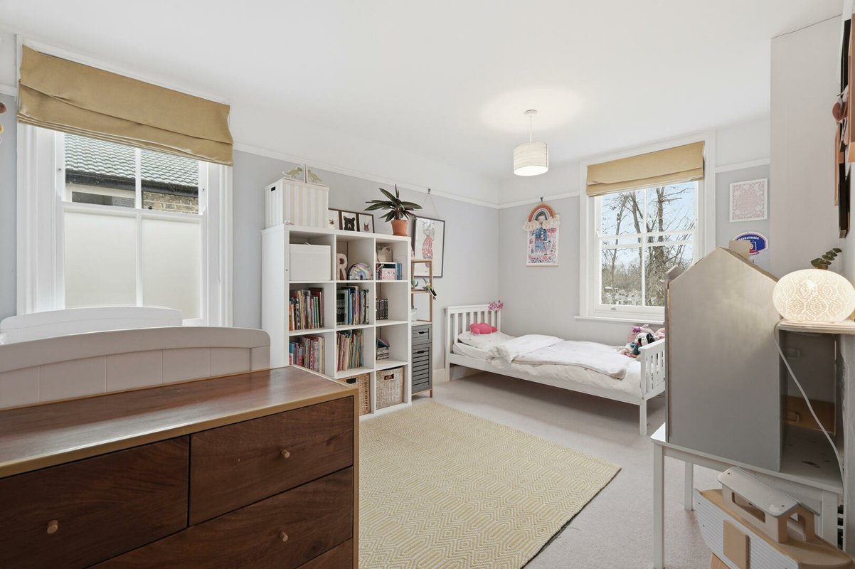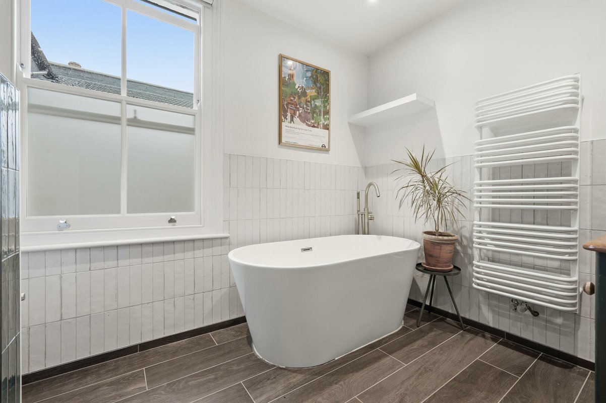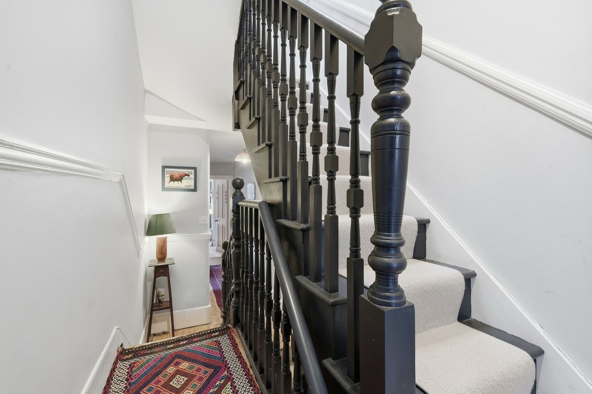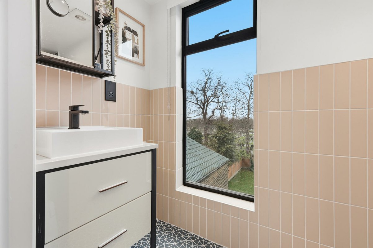 Upon entering, a wide and welcoming hallway sets the tone, retaining much of the home’s original character and exposed timber floorboards. This sense of grandeur continues into the beautifully proportioned double reception room, where original floorboards, detailed cornicing and handsome Victorian fireplaces are complemented by soothing green walls up to the picture rails, with crisp white above to accentuate the impressive ceiling heights. The ground floor has been cleverly reconfigured to suit modern living, featuring a generous utility room and a practical downstairs cloakroom.