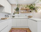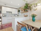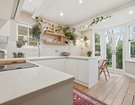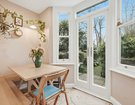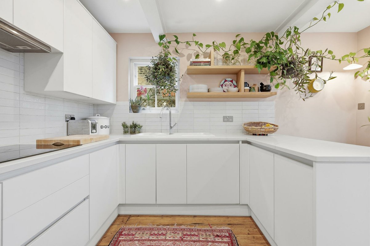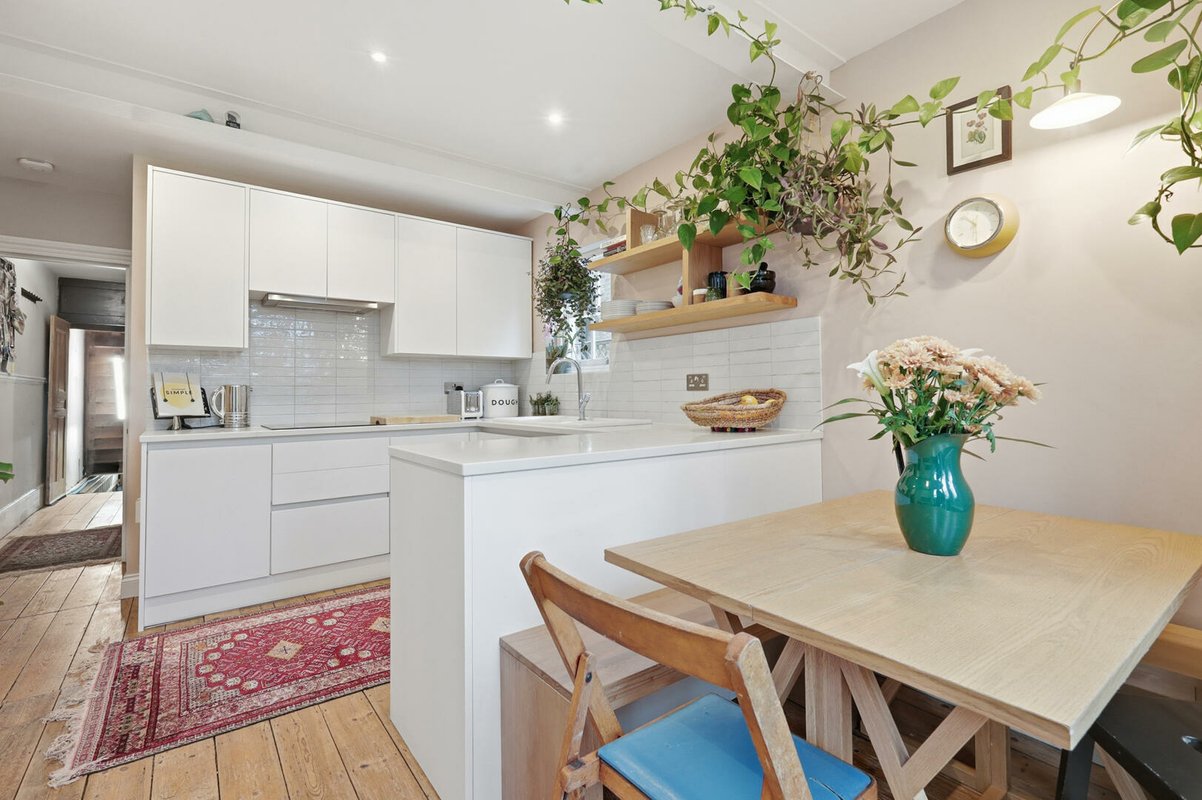 To the rear sits a striking contemporary kitchen, finished in sleek white, handleless high-gloss cabinetry with white worktops and gloss splashback tiles. Warm peach-toned walls and exposed wooden floorboards soften the space, creating a welcoming atmosphere. The kitchen units extend halfway into the room, subtly dividing the kitchen from the breakfast area, which enjoys charming garden views through the original bay window and French doors.