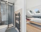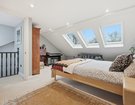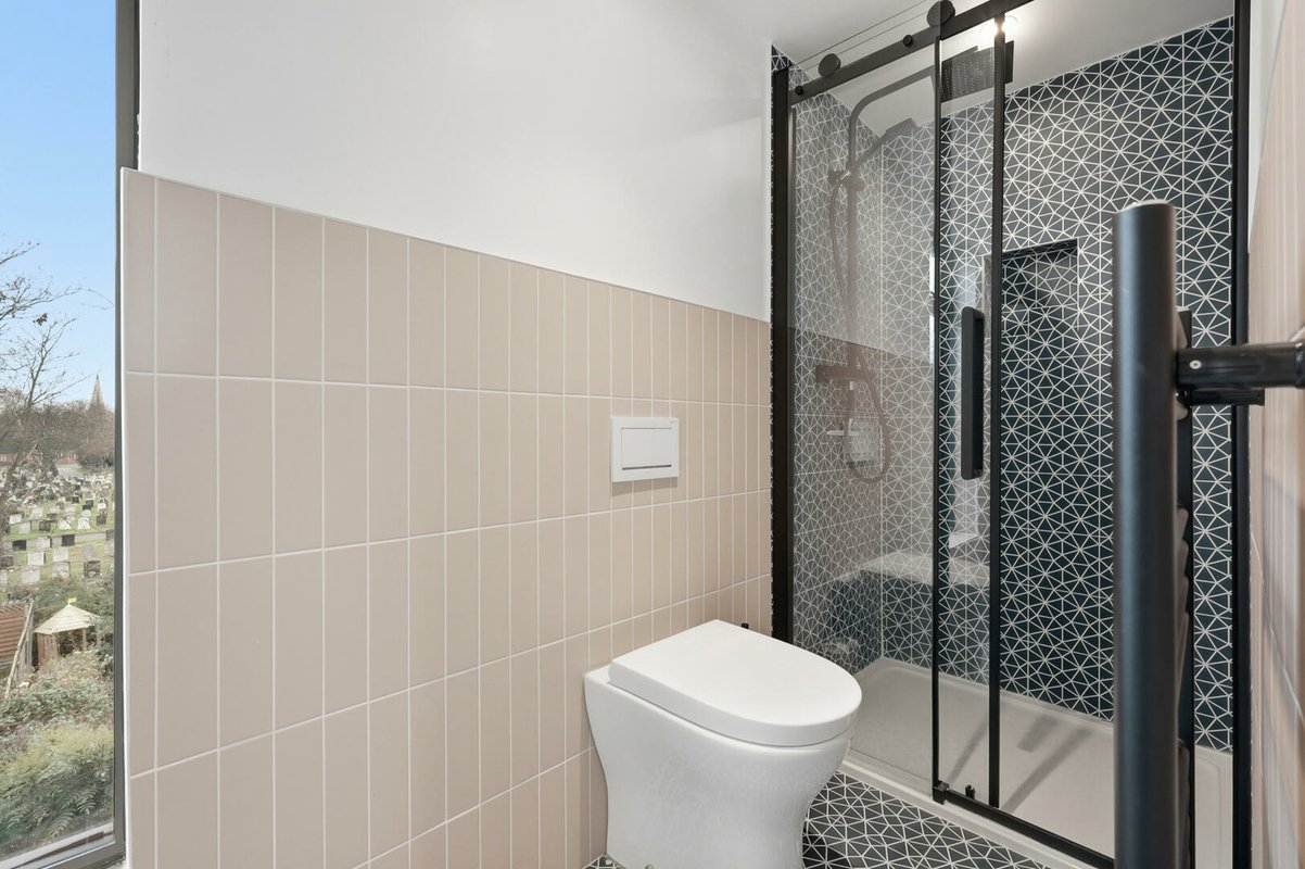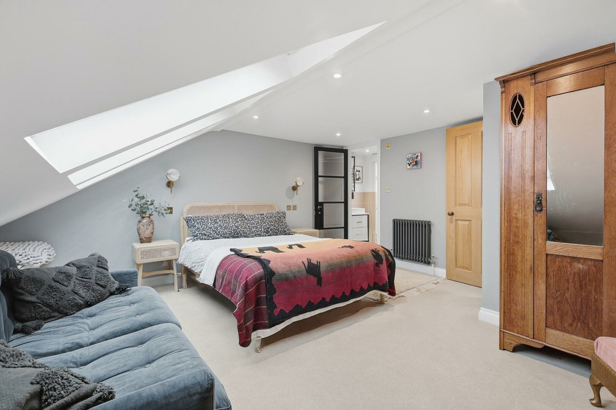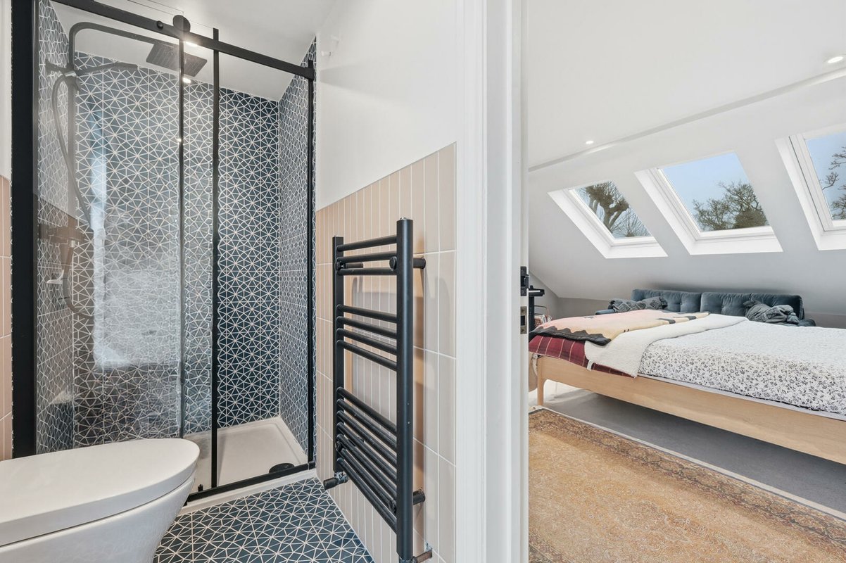 A tiered landing illuminated by a skylight creates the feel of a distinct additional floor rather than a conventional loft conversion. This level offers two further double bedrooms, the principal boasting three skylights and a stunning en-suite shower room. The second bedroom is equally impressive, featuring a striking floor-to-ceiling Crittall-style window and an abundance of built-in storage.