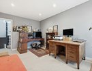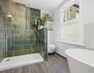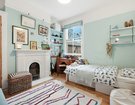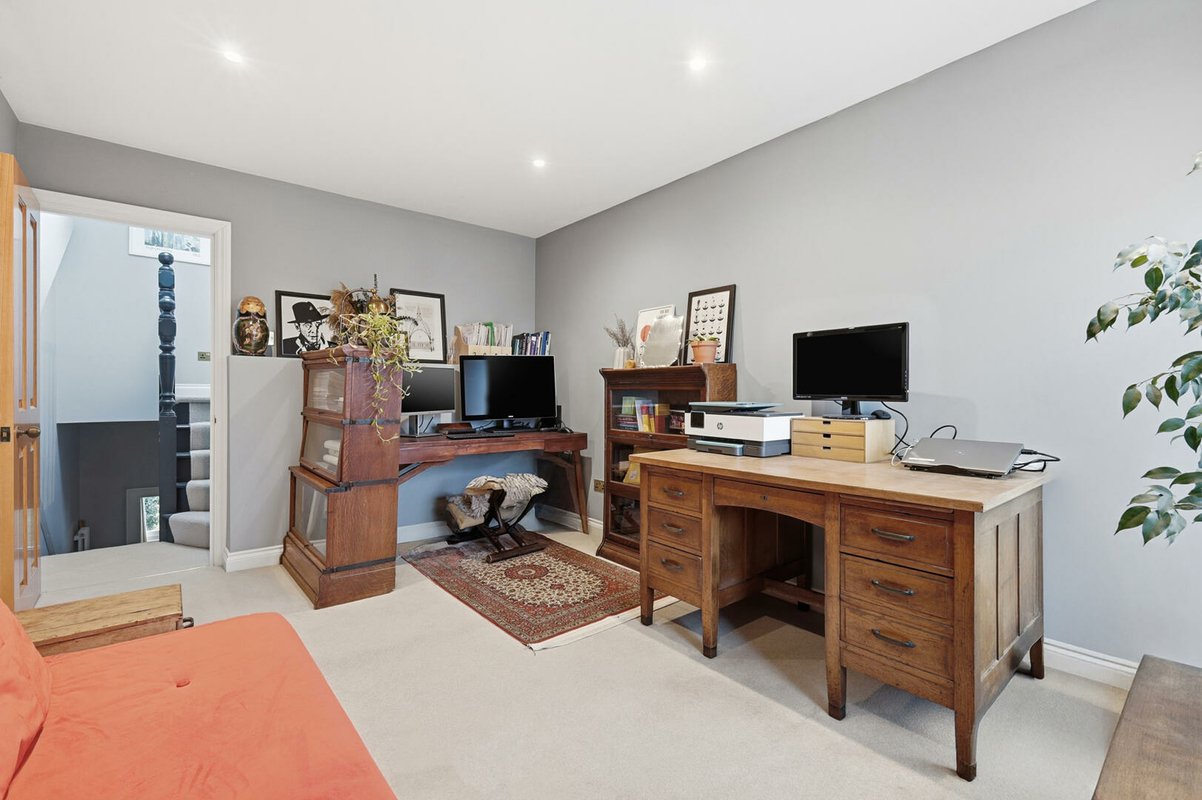 The first-floor hosts three beautifully appointed double bedrooms, each benefitting from bespoke fitted wardrobes and original feature fireplaces. The luxurious family bathroom is generously proportioned, featuring a freestanding bath, a spacious walk-in shower, emerald green tiling and elegant gold fittings. The loft extension is an architectural triumph, meticulously designed to maximise space and natural light.