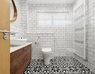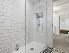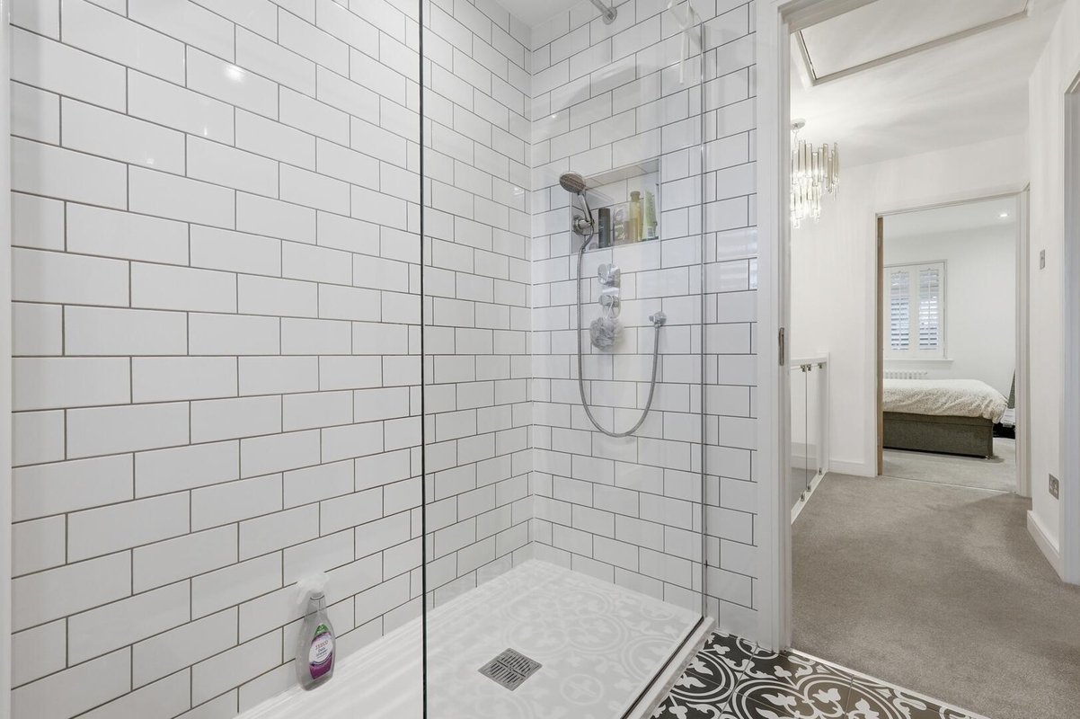 Upstairs, the property offers three well-proportioned double bedrooms, two of which benefit from fitted wardrobes. The contemporary family shower room is beautifully finished, featuring a spacious walk-in shower, fully tiled walls with modern white metro tiles, striking black and white mosaic flooring, and warm wooden vanity storage.
