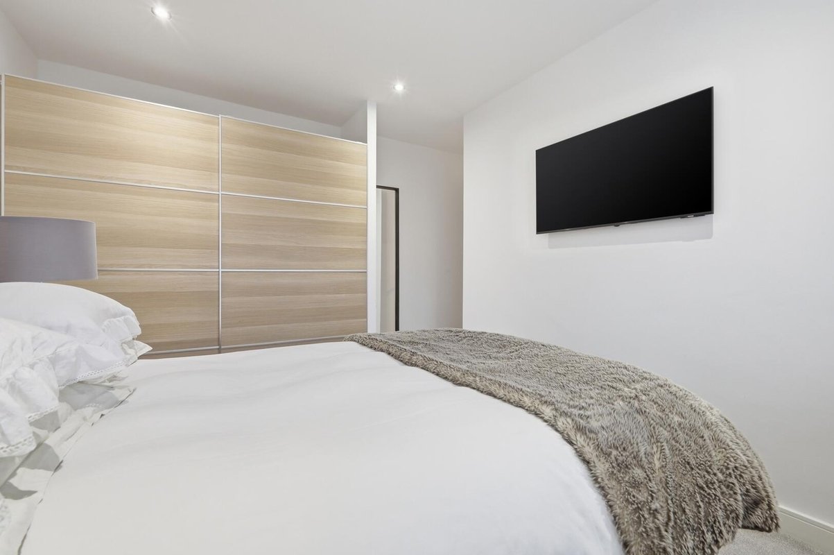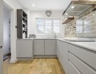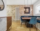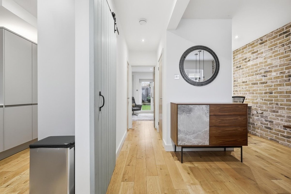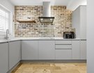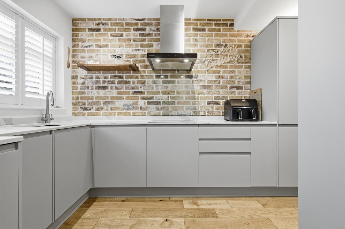 The sleek, handleless kitchen is fitted with stylish cabinetry and finished with striking white quartz worktops, creating a seamless and contemporary feel. A brick facing wall introduces texture and character, while a generous understairs storage area adds practicality.