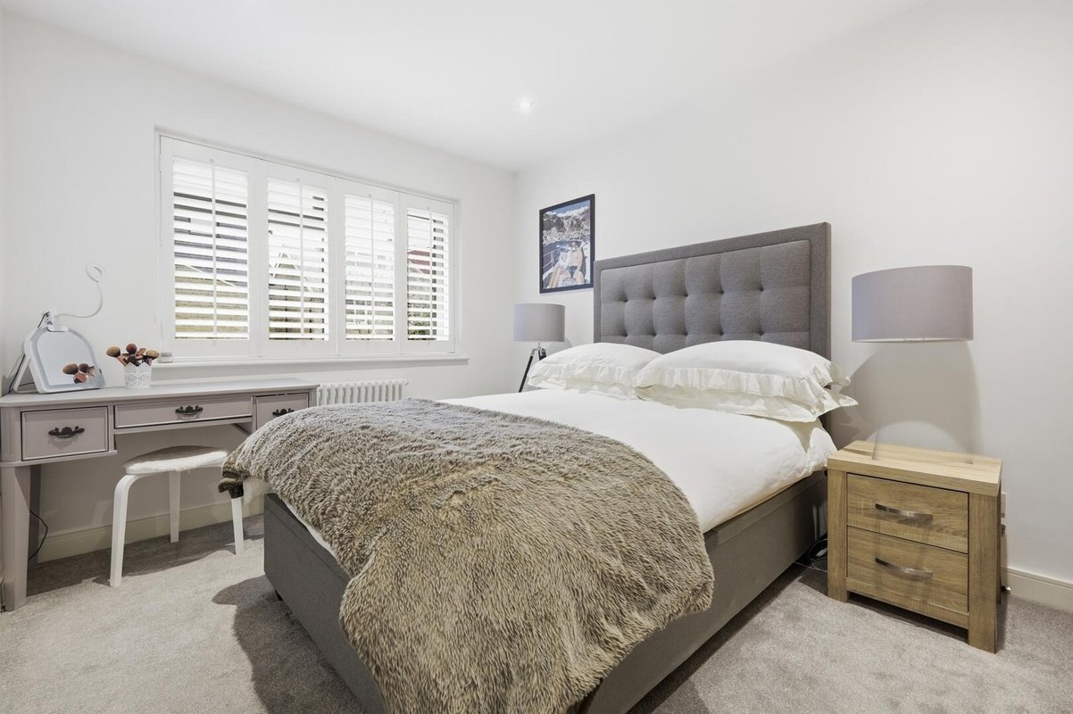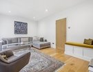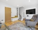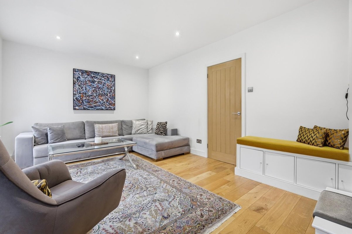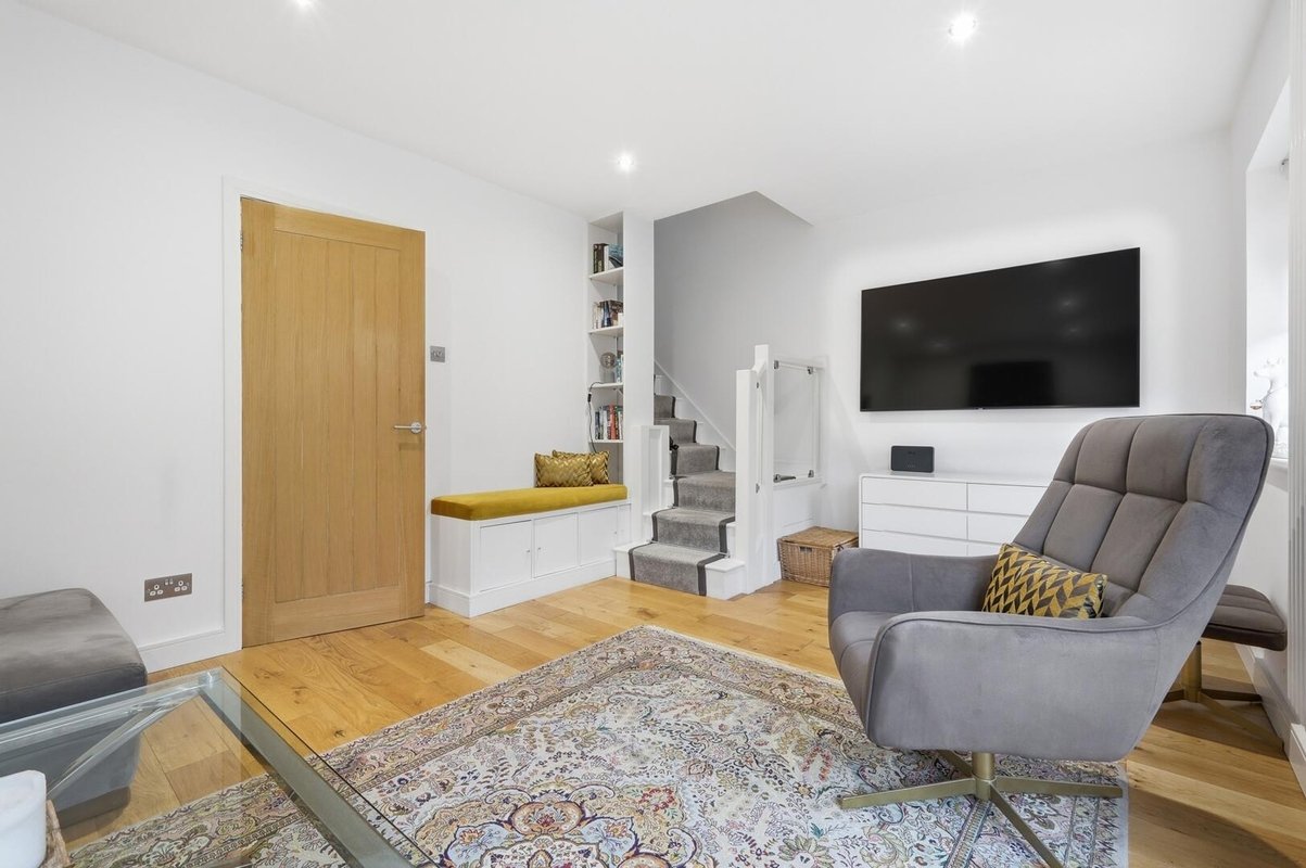 The ground floor features engineered oak flooring, adding warmth and contrast to the crisp white walls and modern, minimalist décor, complemented by schoolhouse-style radiators. The former garage has been expertly converted, allowing for a more open and versatile layout.