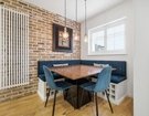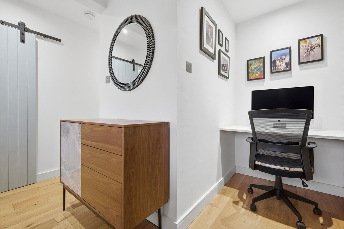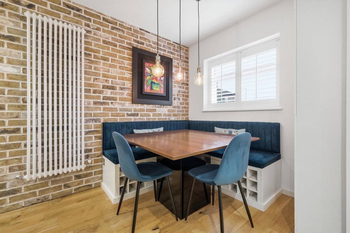 The converted space now provides a superb dining area with bespoke banquette seating, perfectly designed for both everyday living and entertaining. The layout also cleverly incorporates a dedicated workspace, ideal for those working from home.