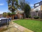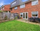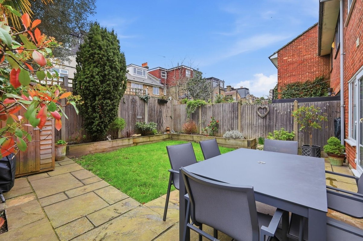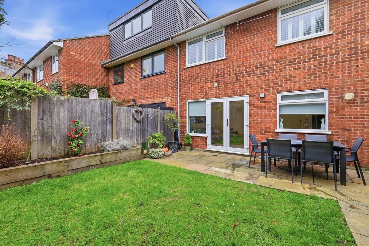 The rear garden is thoughtfully landscaped, offering a perfect balance of patio and lawn, framed by railway sleeper borders.
