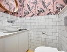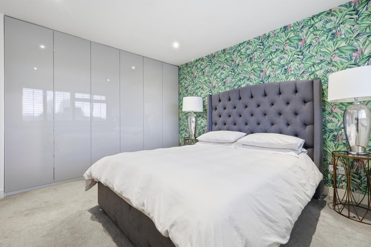 To the rear, the full-width lounge offers a relaxing retreat, flooded with natural light from large windows and patio doors that open onto the garden. Built-in seating and storage further enhance the functionality of this space. A stylish downstairs WC completes the ground floor, featuring white metro tiling paired with bold statement wallpaper.