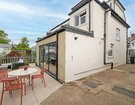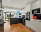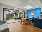 The real heart of the home is the extended kitchen/diner/family room at the rear. Full-width bi-fold doors open onto the West-facing garden, flooding the space with light. The sleek kitchen includes a peninsular island, wine fridge, double oven, and sky lantern above the dining area—ideal for modern family living and entertaining.