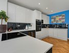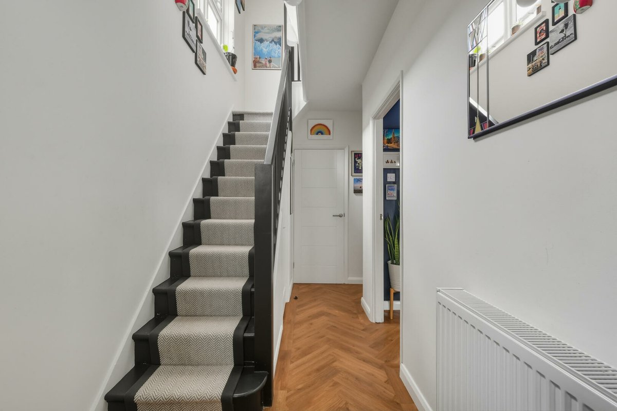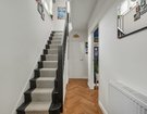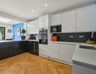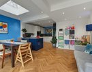 Inside, a practical entrance porch leads to a stylish hallway with herringbone flooring flowing through the ground floor. The formal reception room at the front benefits from a large bay window and extra space thanks to the removed chimney breast. A ground floor cloakroom also houses the washer and dryer.
