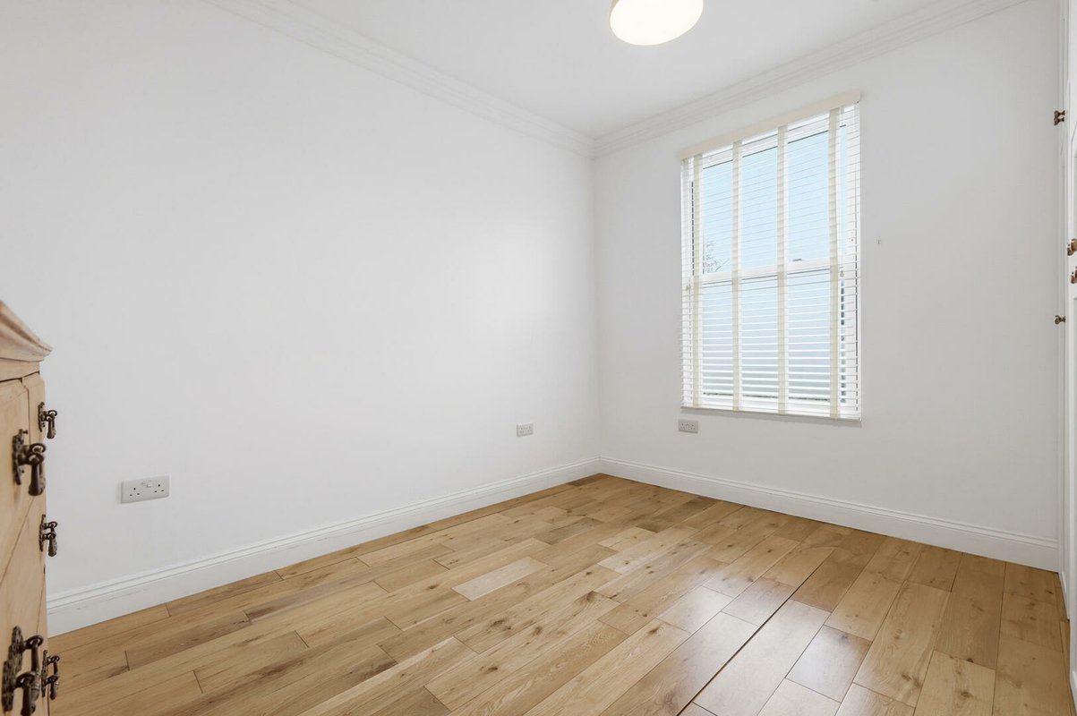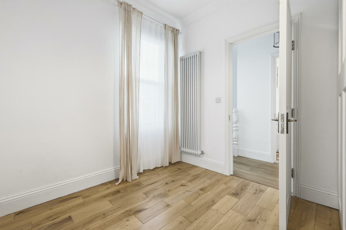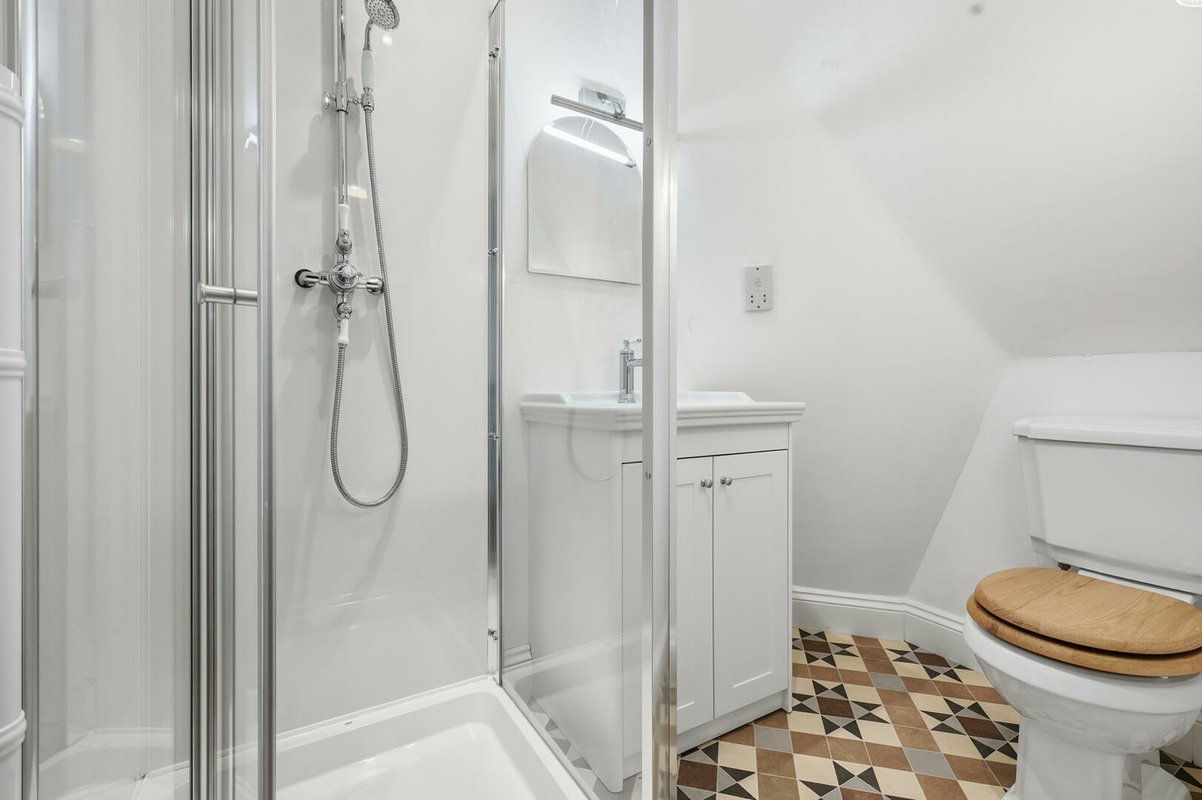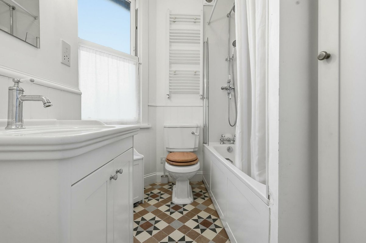 The first floor offers three well-proportioned bedrooms. The largest bedroom boasts a bay window and a walk-in wardrobe, while another bedroom enjoys dual-aspect windows and integrated double wardrobe. A stylish family bathroom with a period-inspired white suite, half-height weatherboarding, and Minton-style flooring completes this level. The top floor hosts two further generous double bedrooms, each with excellent built-in storage. One benefits from its own en-suite shower room, finished with the same thoughtful period detailing as the main bathroom.